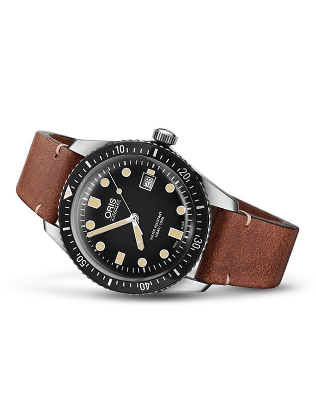 Швейцарские мужские часы ORIS Divers Sixty-Five. Корпус выполнен из высококачественной нержавеющей стали, что обеспечивает прочность и долговечность. Циферблат с традиционными стрелками и метками в виде штрихов защищен устойчивым к царапинам сапфировым стеклом с антибликовым покрытиемСапфировое стеклоПрочный и надёжный материал из кристалла сапфира синтетического происхождения, характеризующийся особой твёрдостью и устойчивостью к царапинам и повреждениям., обеспечивающим отличную читаемость показаний в любых условиях. Механизм Oris 733 — это автоматический механизм с автоподзаводом, который гарантирует точность хода и надежность работы. Функционал включает центральные часовые, минутные и секундные стрелки, окошко даты с быстрым переводом, а также функцию stop-second для точной настройки времени. Запас хода механизма составляет 41 час. Стрелки и метки имеют люминесцентное покрытиеЛюминесцентное покрытиеПозволяет считывать показания времени в темноте. Производители наносят на стрелки, часовые индексы, безель или поверхность циферблата светонакопительный состав, дающий холодное свечение., которое позволяет легко определять время даже в темноте. Поворотный безель из нержавеющей стали с PVD-покрытиемPVDУльтратонкое покрытие наносится в технике вакуумного напыления, сочетает в себе нитрид титана особой прочности со слоем золота или оксида хрома. Несёт в себе декоративную или защитную функцию. помогает точно отслеживать промежутки времени. Водозащита до 100 метров (WR100) делает эти часы идеальными для плавания и других водных видов спорта. Кожаный ремешок на стандартной застёжке.