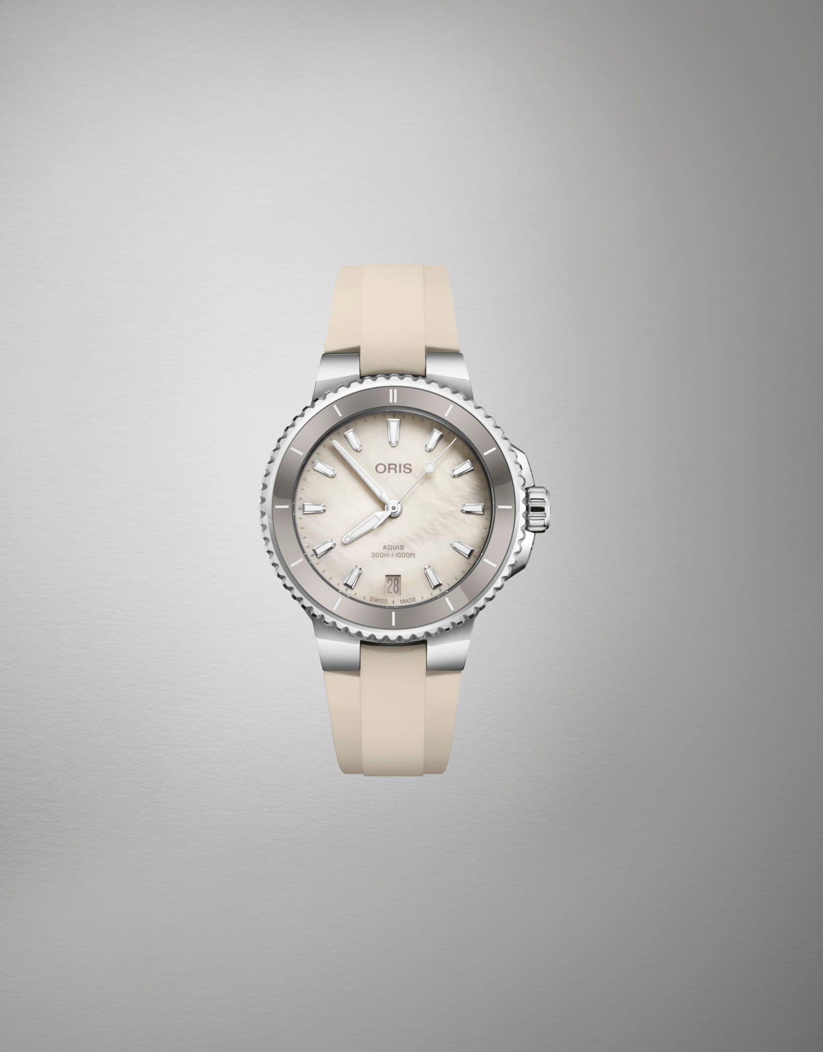 Часы Aquis Date 36.50 мм сверкают, когда свет отражается от их кремового перламутрового циферблата, но пусть это не отвлекает от их характеристик. Корпус из нержавеющей стали водонепроницаем до 30 бар (300 метров), а внутри него установлен автоматический механизм Swiss Made.