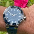 Часы Aquis Small Second Date 45,5 мм оснащены стрелками с люминесцентным покрытиемЛюминесцентное покрытиеПозволяет считывать показания времени в темноте. Производители наносят на стрелки, часовые индексы, безель или поверхность циферблата светонакопительный состав, дающий холодное свечение. для видимости при плохом освещении. Часы водонепроницаемы до 50 бар (500 м), оснащены завинчивающейся заводной головкой, вращающимся стальным безелемБезельВнешний ободок, закрепляющий стекло. В спортивных часах так называется поворотное кольцо с делениями на циферблате, выполняет роль таймера – замеряет отрезки времени на шкале. Неподвижный безель – элемент декора. Однонаправленно вращающийся безель на дайверских часах позволяет фиксировать моменты погружения и выныривания на поверхность. с керамической вставкой и каучуковым ремешком.