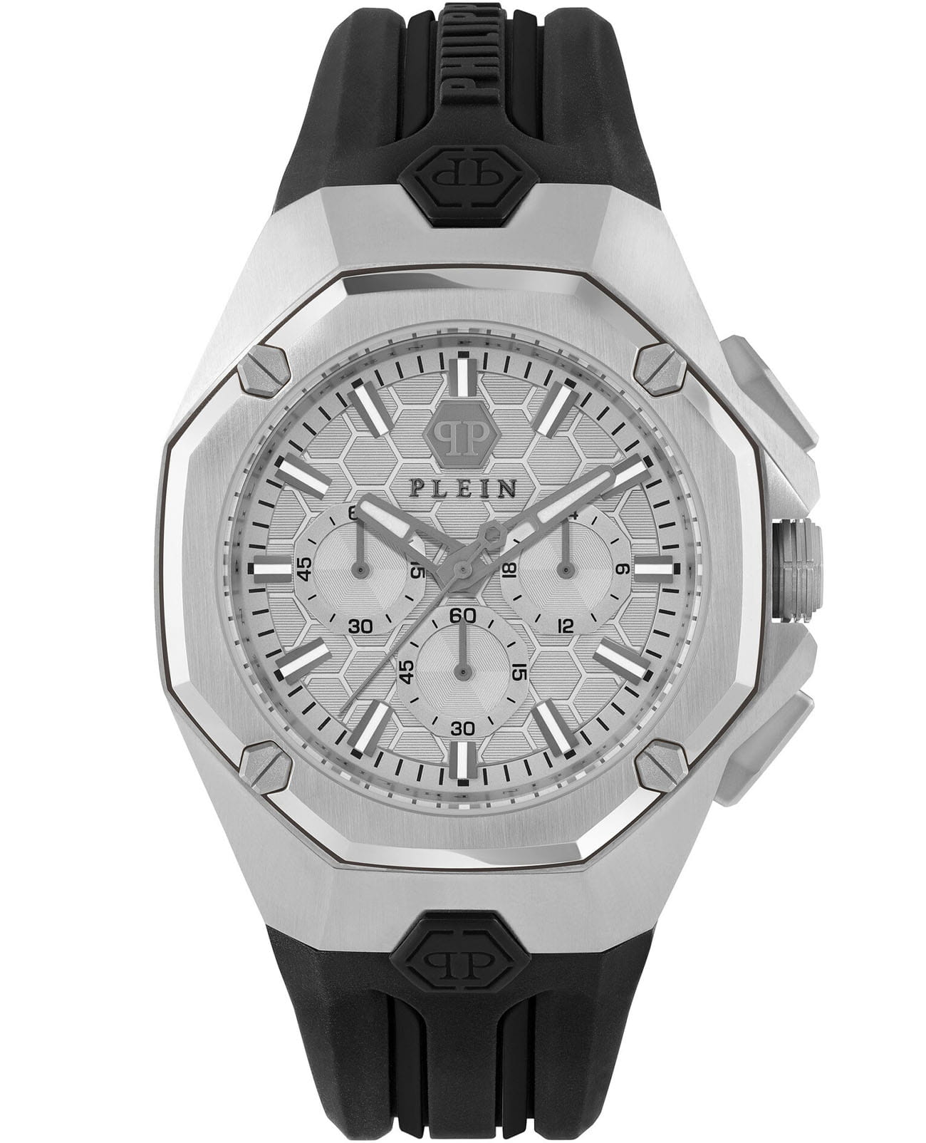 Мужские часы c хронографомХронографФункция позволяет измерять отрезки времени с особой точностью: часы, минуты, секунды. Верным признаком хронографа является наличие на циферблате 3 дополнительных окошек-счётчиков. Philipp Plein Octagon PWTBA0123, кварцевый механизм с высокой точностью. Класс водозащиты: 50 метров, позволит защитить корпус от случайных брызг или капель дождя. Корпус часов изготовлен из нержавеющей стали. Стрелки и метки с люминесцентным покрытиемЛюминесцентное покрытиеПозволяет считывать показания времени в темноте. Производители наносят на стрелки, часовые индексы, безель или поверхность циферблата светонакопительный состав, дающий холодное свечение.. 12 и 24-часовой формат времени. Минеральное стеклоМинеральное стеклоМинеральное стекло представляет собой искусственно выращенный минерал кварца. Такое стекло отличается особой устойчивостью к повреждениям и царапинам. Уступает по некоторым качествам сапфировому стеклу. устойчивое к мелким механическим повреждениям.