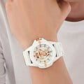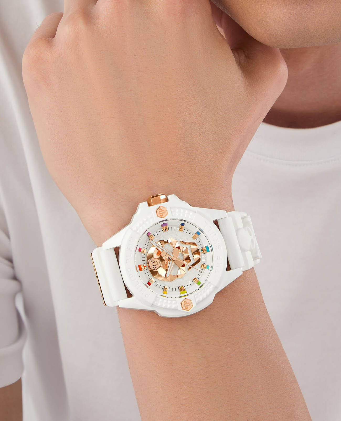 Мужские часы Philipp Plein The Skull Ecoceramic PWUBA0123, кварцевый механизм с высокой точностью. Класс водозащиты: 50 метров, позволит защитить корпус от случайных брызг или капель дождя. Корпус часов изготовлен из экокерамики. Минеральное стеклоМинеральное стеклоМинеральное стекло представляет собой искусственно выращенный минерал кварца. Такое стекло отличается особой устойчивостью к повреждениям и царапинам. Уступает по некоторым качествам сапфировому стеклу. устойчивое к мелким механическим повреждениям. Стрелки с люминесцентным покрытиемЛюминесцентное покрытиеПозволяет считывать показания времени в темноте. Производители наносят на стрелки, часовые индексы, безель или поверхность циферблата светонакопительный состав, дающий холодное свечение..