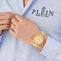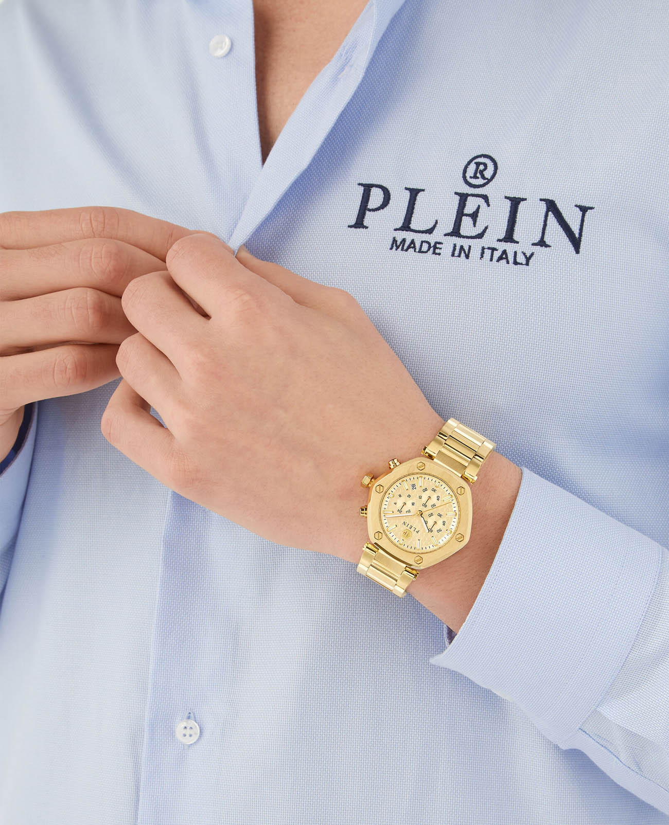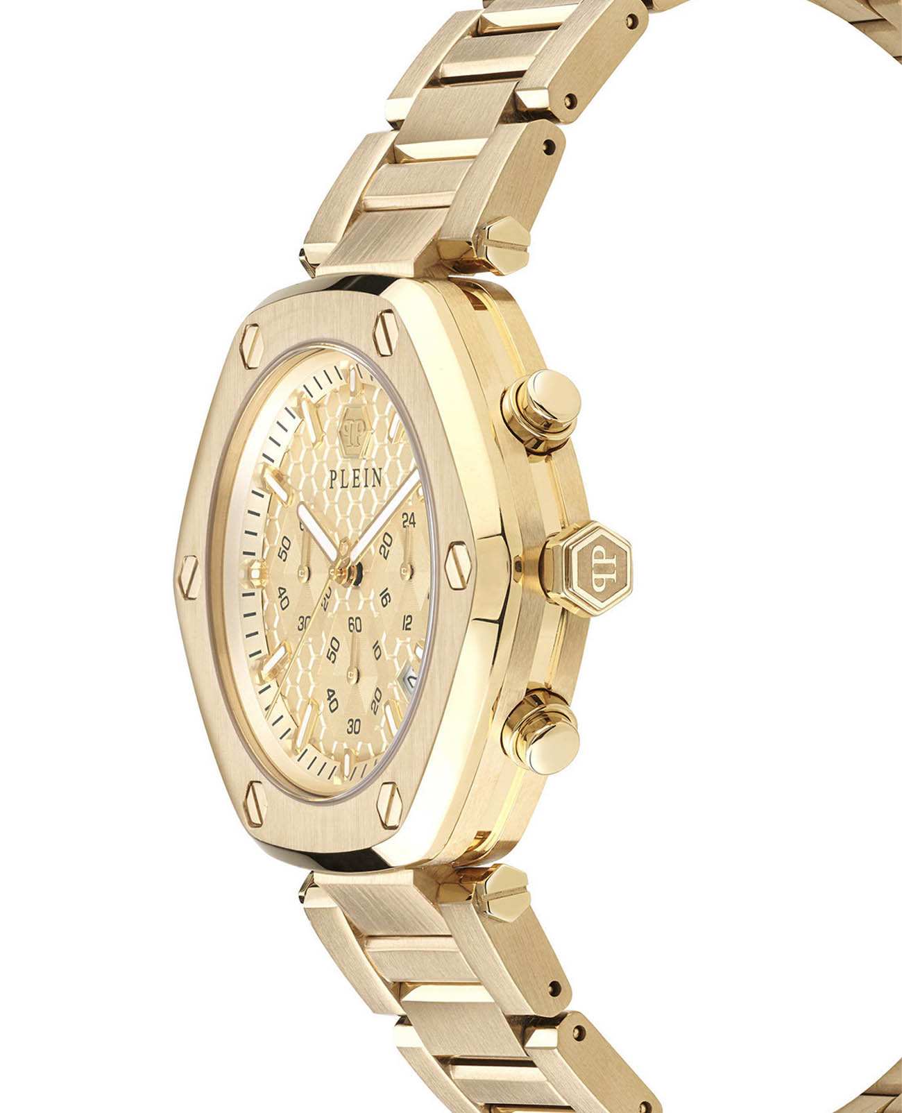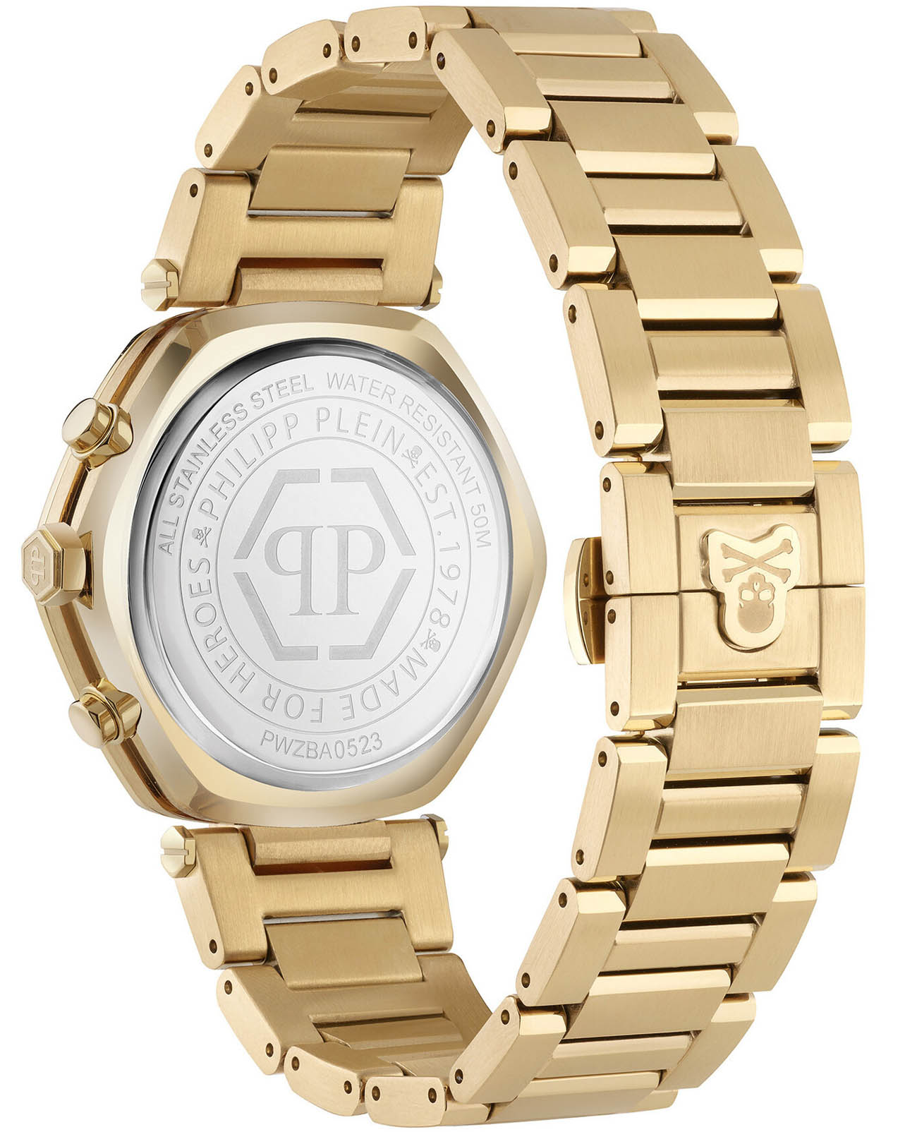 Мужские часы c хронографомХронографФункция позволяет измерять отрезки времени с особой точностью: часы, минуты, секунды. Верным признаком хронографа является наличие на циферблате 3 дополнительных окошек-счётчиков. Philipp Plein The Hexagon Chrono PWZBA0523 с надежным кварцевым механизмом. Корпус и браслет часов изготовлены из нержавеющей стали с IP-покрытиемIP-покрытиеМетод ионного напыления. Демонстрирует повышенную устойчивость к истиранию, окислению и химическим веществам. Под воздействием высокого давления и температуры около 1500°C молекулы металла надёжно соединяются с частицами корпуса часов.. Минеральное стеклоМинеральное стеклоМинеральное стекло представляет собой искусственно выращенный минерал кварца. Такое стекло отличается особой устойчивостью к повреждениям и царапинам. Уступает по некоторым качествам сапфировому стеклу. устойчивое к мелким механическим повреждениям. Влагозащита: 50 метров, позволит защитить корпус от случайных брызг или капель дождя. Стрелки и метки с люминесцентным покрытиемЛюминесцентное покрытиеПозволяет считывать показания времени в темноте. Производители наносят на стрелки, часовые индексы, безель или поверхность циферблата светонакопительный состав, дающий холодное свечение.. 24-часовой формат на дополнительном циферблате. Браслет на застёжке-бабочке с кнопкамиЗастёжка "бабочка"Такой вид застёжки дополняется предохранителями, помогающими избежать случайного раскрытия браслета. Обладают изящным исполнением. .