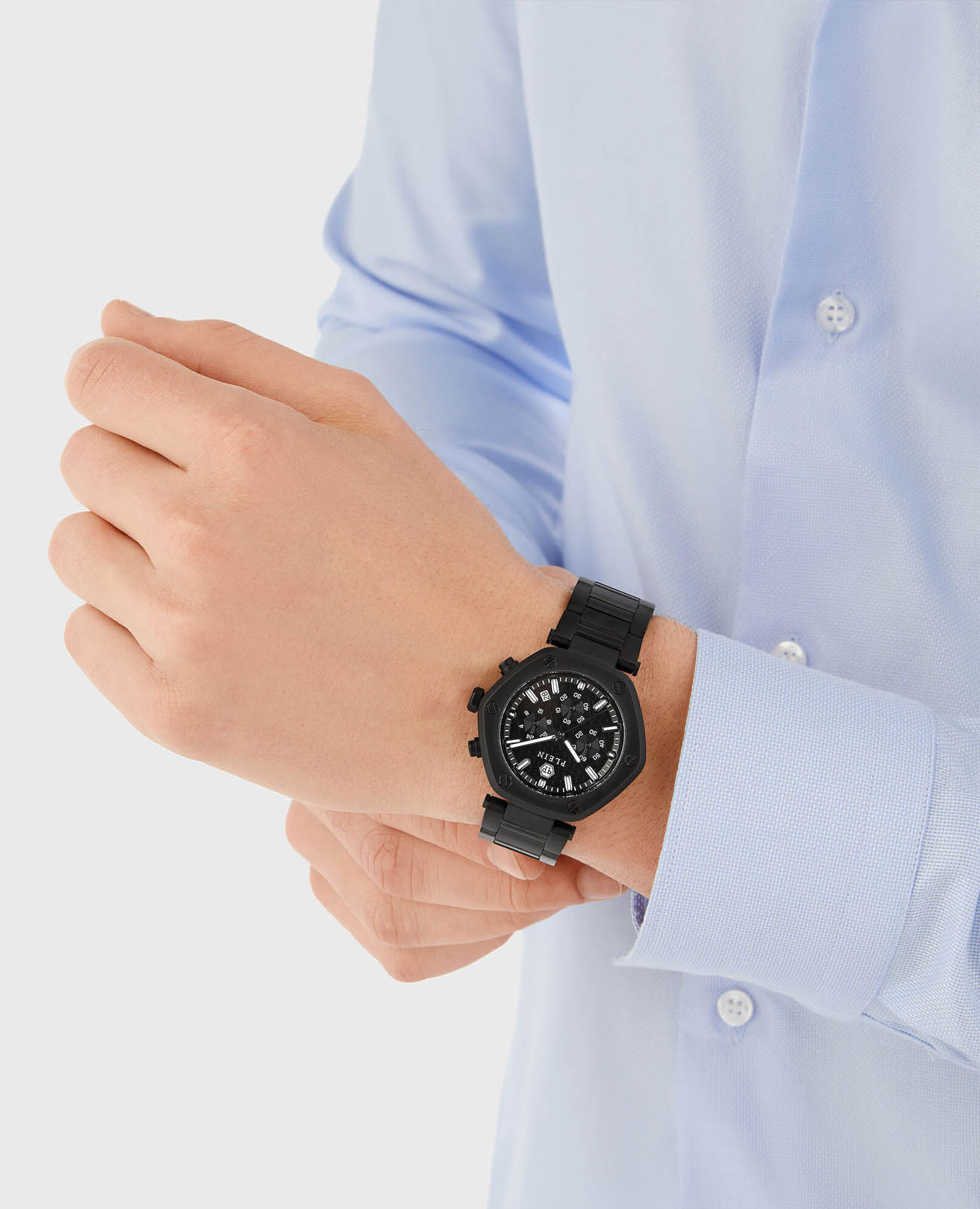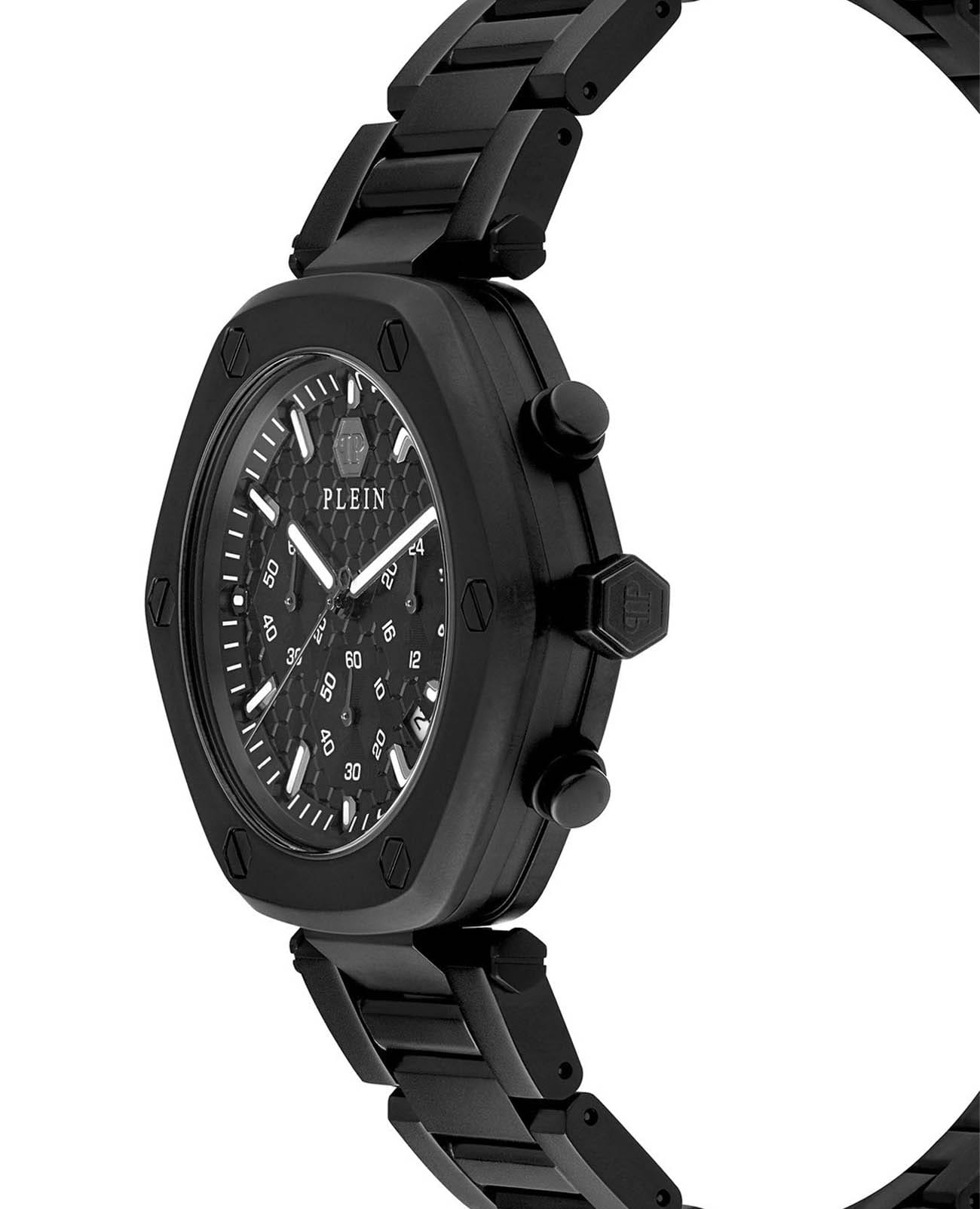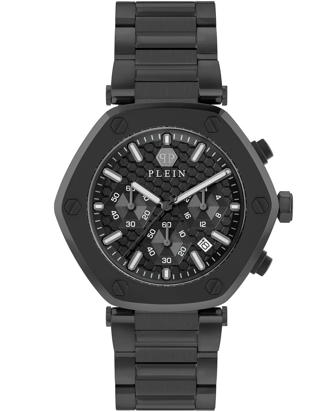 Мужские часы c хронографомХронографФункция позволяет измерять отрезки времени с особой точностью: часы, минуты, секунды. Верным признаком хронографа является наличие на циферблате 3 дополнительных окошек-счётчиков. Philipp Plein The Hexagon Chrono PWZBA0623 с надежным кварцевым механизмом. Корпус и браслет часов изготовлены из нержавеющей стали с IP-покрытиемIP-покрытиеМетод ионного напыления. Демонстрирует повышенную устойчивость к истиранию, окислению и химическим веществам. Под воздействием высокого давления и температуры около 1500°C молекулы металла надёжно соединяются с частицами корпуса часов.. Минеральное стеклоМинеральное стеклоМинеральное стекло представляет собой искусственно выращенный минерал кварца. Такое стекло отличается особой устойчивостью к повреждениям и царапинам. Уступает по некоторым качествам сапфировому стеклу. устойчивое к мелким механическим повреждениям. Влагозащита: 50 метров, позволит защитить корпус от случайных брызг или капель дождя. Стрелки и метки с люминесцентным покрытиемЛюминесцентное покрытиеПозволяет считывать показания времени в темноте. Производители наносят на стрелки, часовые индексы, безель или поверхность циферблата светонакопительный состав, дающий холодное свечение.. 24-часовой формат на дополнительном циферблате. Браслет на застёжке-бабочке с кнопкамиЗастёжка "бабочка"Такой вид застёжки дополняется предохранителями, помогающими избежать случайного раскрытия браслета. Обладают изящным исполнением. .