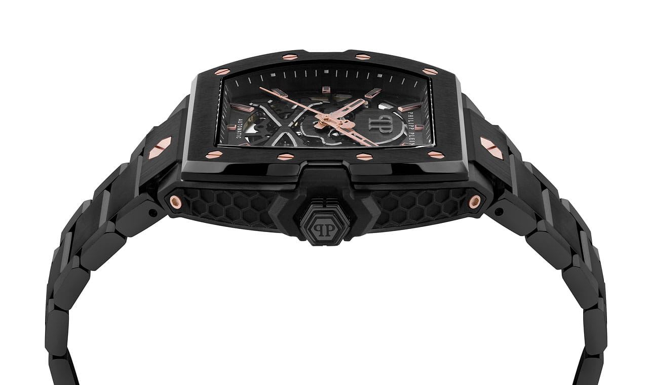 Philipp Plein The $keleton 2.0 PWJFA0725 - это дерзкие и бескомпромиссные часы, воплощающие бунтарский дух бренда. Их отличает узнаваемый мотив черепа, ставший визитной карточкой Philipp Plein, искусно интегрированный в дизайн циферблата. Скелетонизированные мужские механические часы с автоподзаводом. Бочкообразный стальной корпус диаметром 44 мм с PVD-покрытиемPVDУльтратонкое покрытие наносится в технике вакуумного напыления, сочетает в себе нитрид титана особой прочности со слоем золота или оксида хрома. Несёт в себе декоративную или защитную функцию.. Стальной браслет на застёжке-бабочке с кнопкамиЗастёжка "бабочка"Такой вид застёжки дополняется предохранителями, помогающими избежать случайного раскрытия браслета. Обладают изящным исполнением. обеспечивает надёжную фиксацию и комфортное ношение. Метки в виде точек. Минеральное стеклоМинеральное стеклоМинеральное стекло представляет собой искусственно выращенный минерал кварца. Такое стекло отличается особой устойчивостью к повреждениям и царапинам. Уступает по некоторым качествам сапфировому стеклу. защищает циферблат от царапин. Люминесцентное покрытиеЛюминесцентное покрытиеПозволяет считывать показания времени в темноте. Производители наносят на стрелки, часовые индексы, безель или поверхность циферблата светонакопительный состав, дающий холодное свечение. стрелок и меток позволит следить за временем даже в полной темноте. Граненая заводная головка. Влагозащита: 50 метров, позволит защитить корпус от случайных брызг или капель дождя. Идеальный аксессуар для тех, кто ценит индивидуальность и не боится выделяться из толпы.