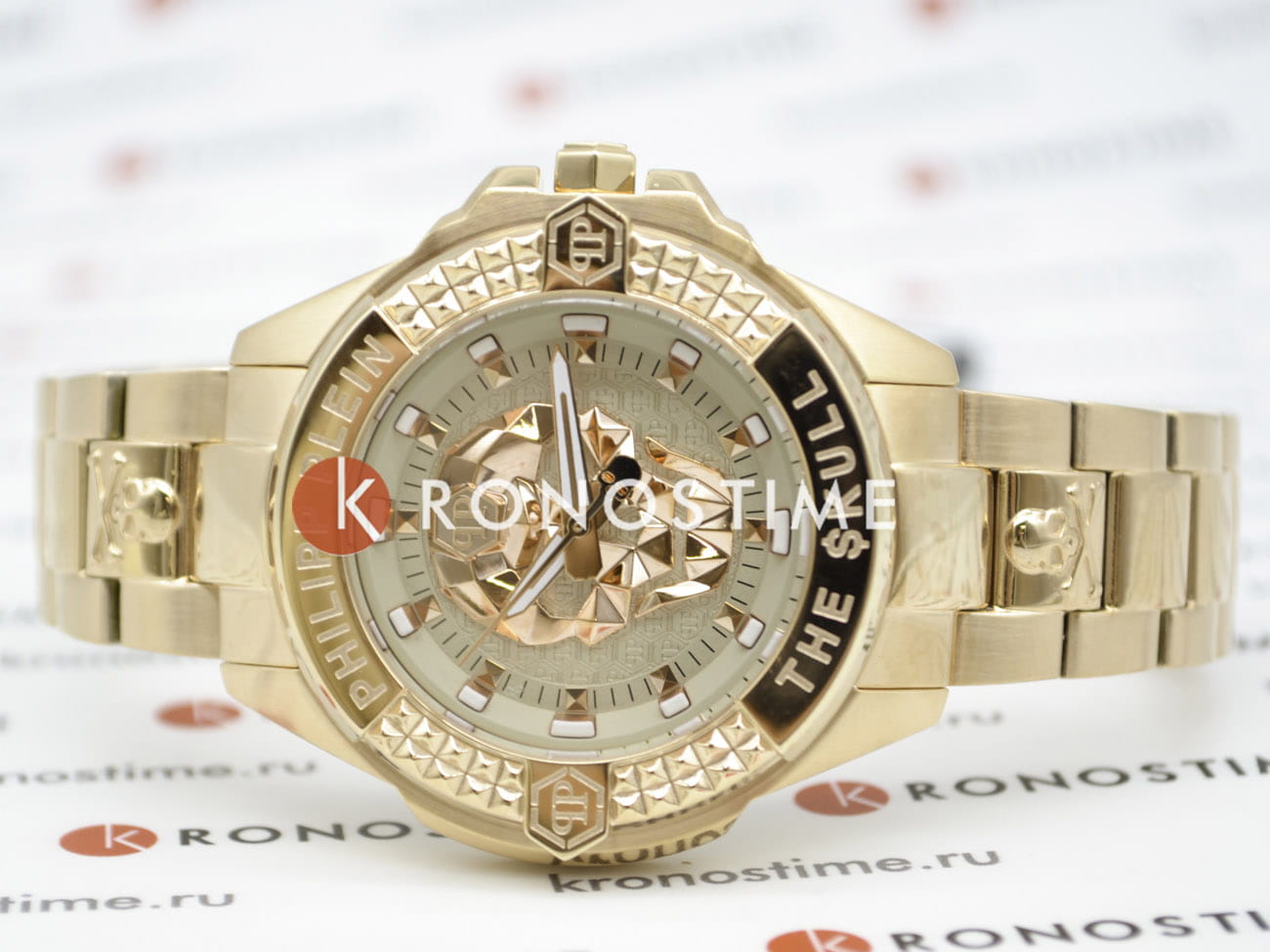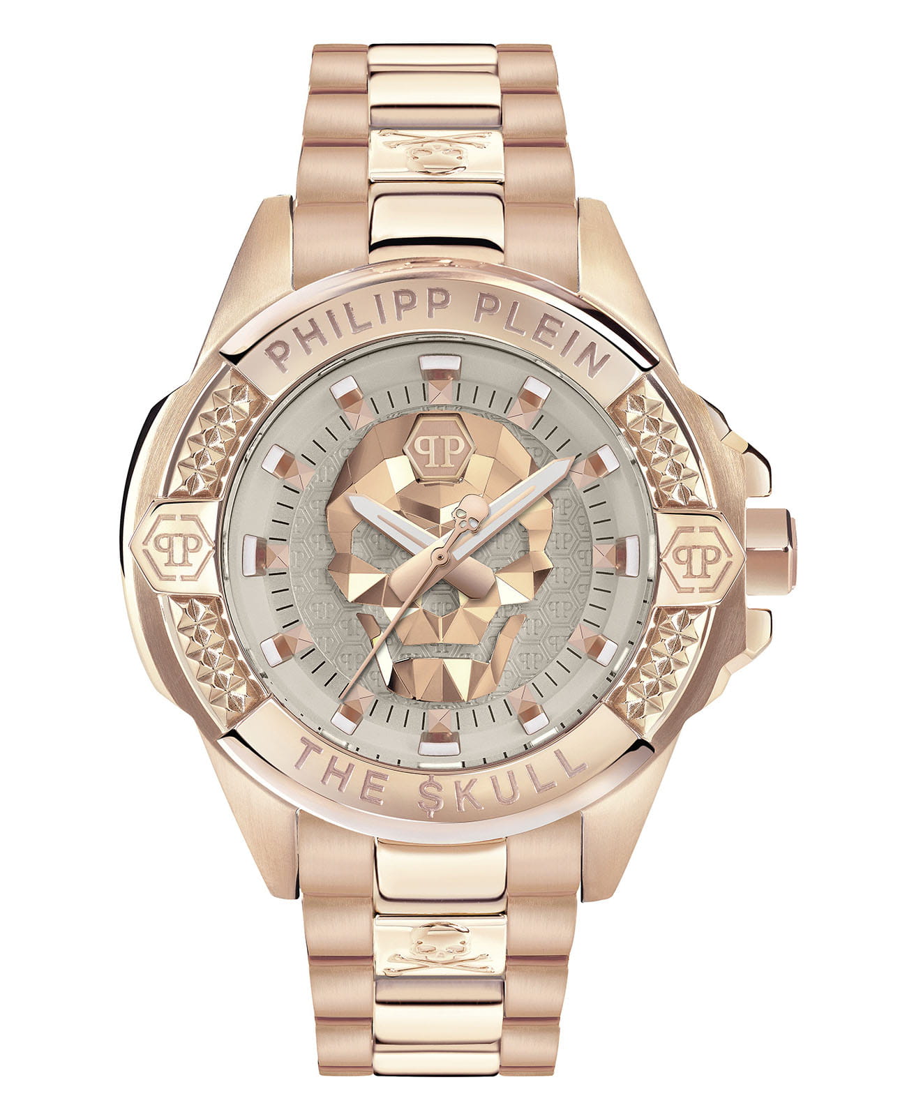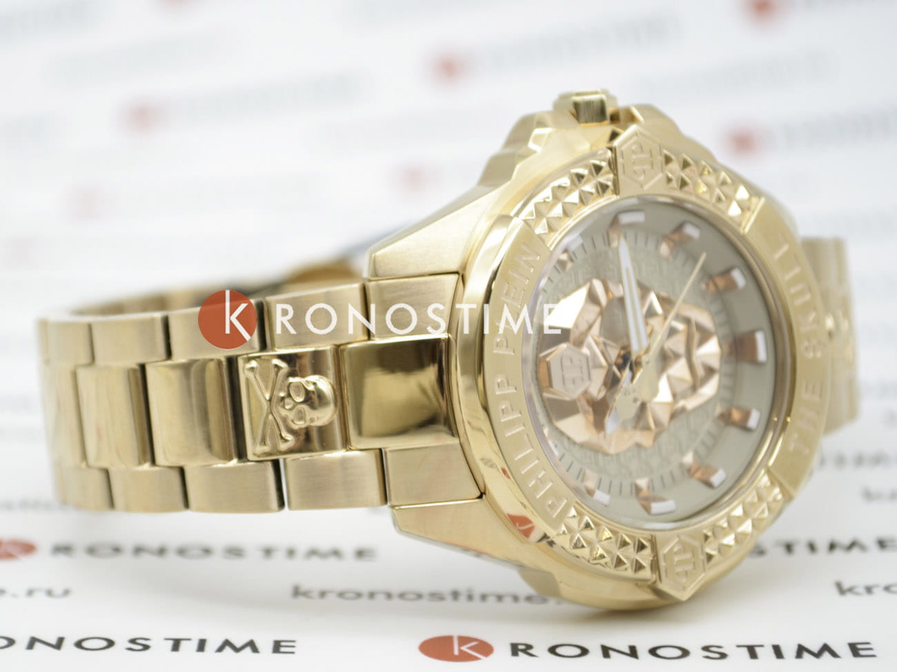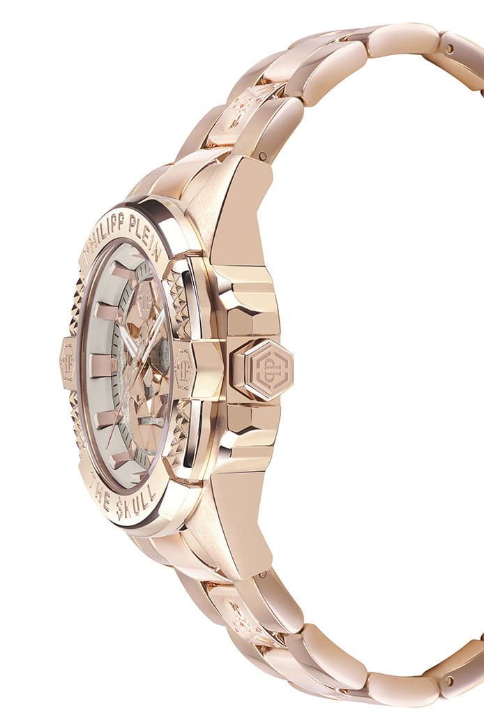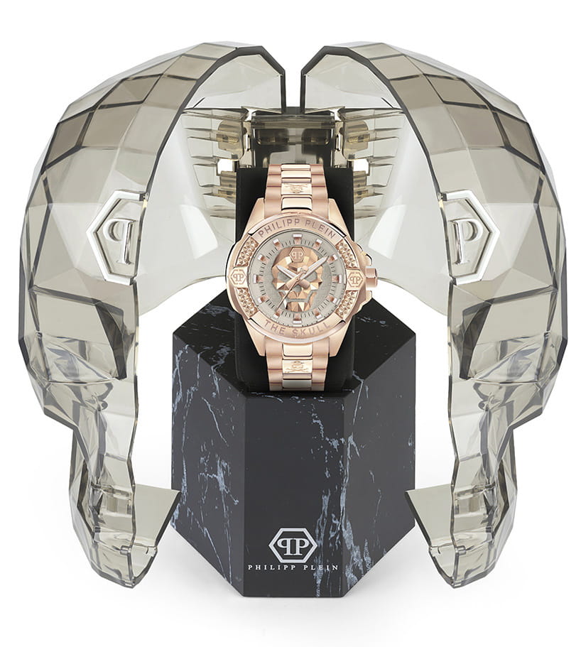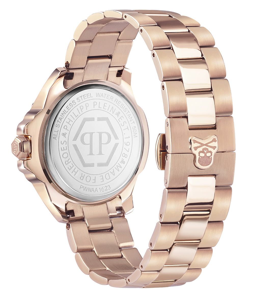 Яркие женские часы с минеральным стекломМинеральное стеклоМинеральное стекло представляет собой искусственно выращенный минерал кварца. Такое стекло отличается особой устойчивостью к повреждениям и царапинам. Уступает по некоторым качествам сапфировому стеклу. Philipp Plein The Skull PWNAA1623, кварцевый механизм с высокой точностью. Класс водозащиты: 50 метров, позволит защитить корпус от случайных брызг или капель дождя. Корпус часов изготовлен из стали с IP-покрытиемIP-покрытиеМетод ионного напыления. Демонстрирует повышенную устойчивость к истиранию, окислению и химическим веществам. Под воздействием высокого давления и температуры около 1500°C молекулы металла надёжно соединяются с частицами корпуса часов.. Циферблат с метками в виде точек украшенных, дополнен трехмерным граненым черепом. Шестигранная заводная головка с защитой. Застёжка бабочка с кнопкамиЗастёжка "бабочка"Такой вид застёжки дополняется предохранителями, помогающими избежать случайного раскрытия браслета. Обладают изящным исполнением. .