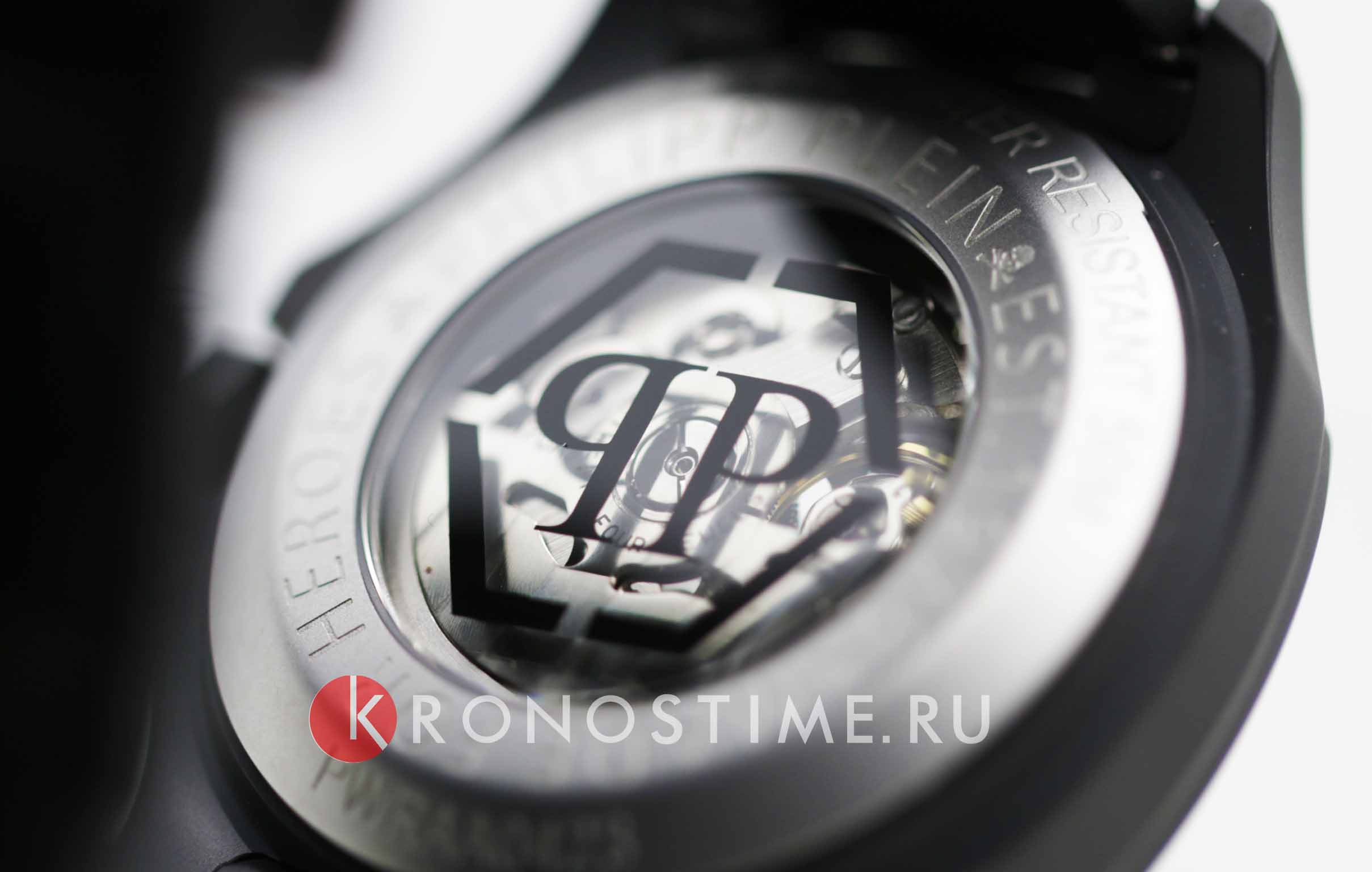 Яркие мужские часы с минеральным стекломМинеральное стеклоМинеральное стекло представляет собой искусственно выращенный минерал кварца. Такое стекло отличается особой устойчивостью к повреждениям и царапинам. Уступает по некоторым качествам сапфировому стеклу. Philipp Plein PWRAA0423, механический механизм с автоподзаводом.  Класс водозащиты: 50 метров, позволит защитить корпус от случайных брызг или капель дождя. Корпус часов изготовлен из стали с IP-покрытиемIP-покрытиеМетод ионного напыления. Демонстрирует повышенную устойчивость к истиранию, окислению и химическим веществам. Под воздействием высокого давления и температуры около 1500°C молекулы металла надёжно соединяются с частицами корпуса часов.. Стрелки и метки с люминесцентным покрытиемЛюминесцентное покрытиеПозволяет считывать показания времени в темноте. Производители наносят на стрелки, часовые индексы, безель или поверхность циферблата светонакопительный состав, дающий холодное свечение.. Скелетонизированные. Часы с механизмом, из которого удалён весь «лишний» металл, с прозрачными циферблатом и задней крышкой. Застёжка бабочка с кнопкамиЗастёжка "бабочка"Такой вид застёжки дополняется предохранителями, помогающими избежать случайного раскрытия браслета. Обладают изящным исполнением.