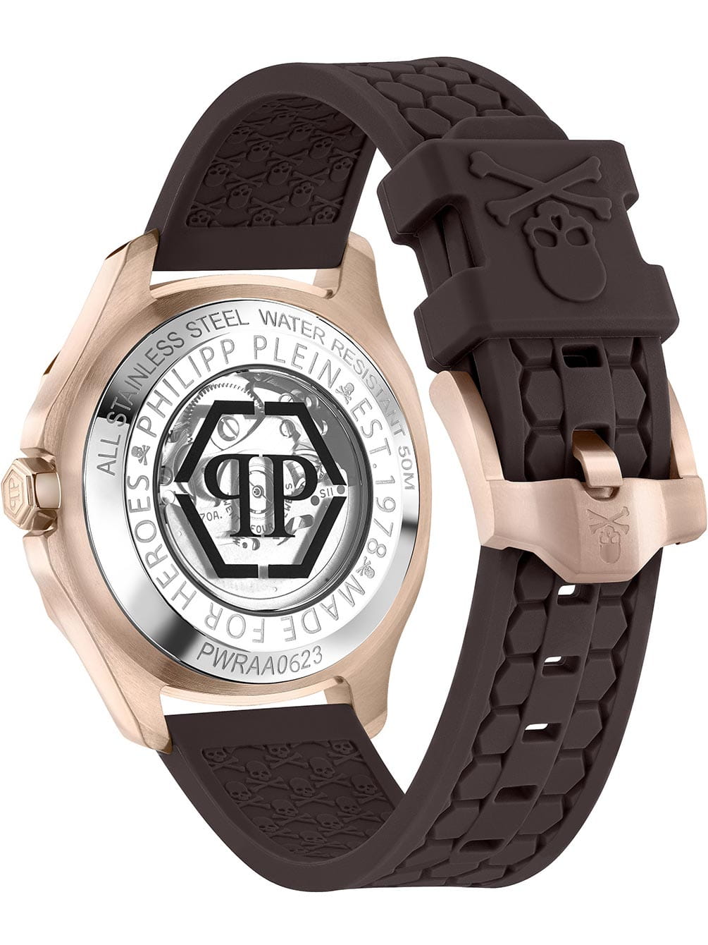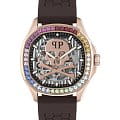 Яркие мужские часы с минеральным стекломМинеральное стеклоМинеральное стекло представляет собой искусственно выращенный минерал кварца. Такое стекло отличается особой устойчивостью к повреждениям и царапинам. Уступает по некоторым качествам сапфировому стеклу. Philipp Plein PWRAA0623, механический механизм.  Класс водозащиты: 50 метров, позволит защитить корпус от случайных брызг или капель дождя. Корпус часов изготовлен из стали и украшен кристаллами. Стрелки и метки с люминесцентным покрытиемЛюминесцентное покрытиеПозволяет считывать показания времени в темноте. Производители наносят на стрелки, часовые индексы, безель или поверхность циферблата светонакопительный состав, дающий холодное свечение.. Скелетонизированные. Часы с механизмом, из которого удалён весь «лишний» металл, с прозрачными циферблатом и задней крышкой,