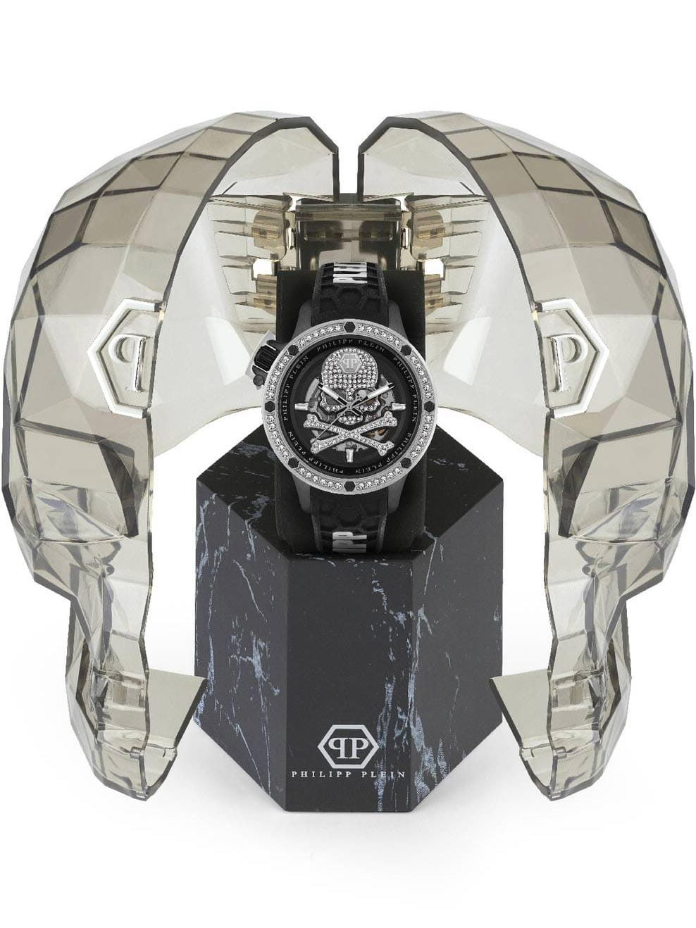 Яркие мужские часы с минеральным стекломМинеральное стеклоМинеральное стекло представляет собой искусственно выращенный минерал кварца. Такое стекло отличается особой устойчивостью к повреждениям и царапинам. Уступает по некоторым качествам сапфировому стеклу. Philipp Plein PWUAA0123, механический механизм с автоподзаводом. Класс водозащиты: 50 метров, позволит защитить корпус от случайных брызг или капель дождя. Корпус часов изготовлен из стали с частичным IP-покрытиемIP-покрытиеМетод ионного напыления. Демонстрирует повышенную устойчивость к истиранию, окислению и химическим веществам. Под воздействием высокого давления и температуры около 1500°C молекулы металла надёжно соединяются с частицами корпуса часов. и украшен кристаллами. Стрелки и метки с люминесцентным покрытиемЛюминесцентное покрытиеПозволяет считывать показания времени в темноте. Производители наносят на стрелки, часовые индексы, безель или поверхность циферблата светонакопительный состав, дающий холодное свечение..