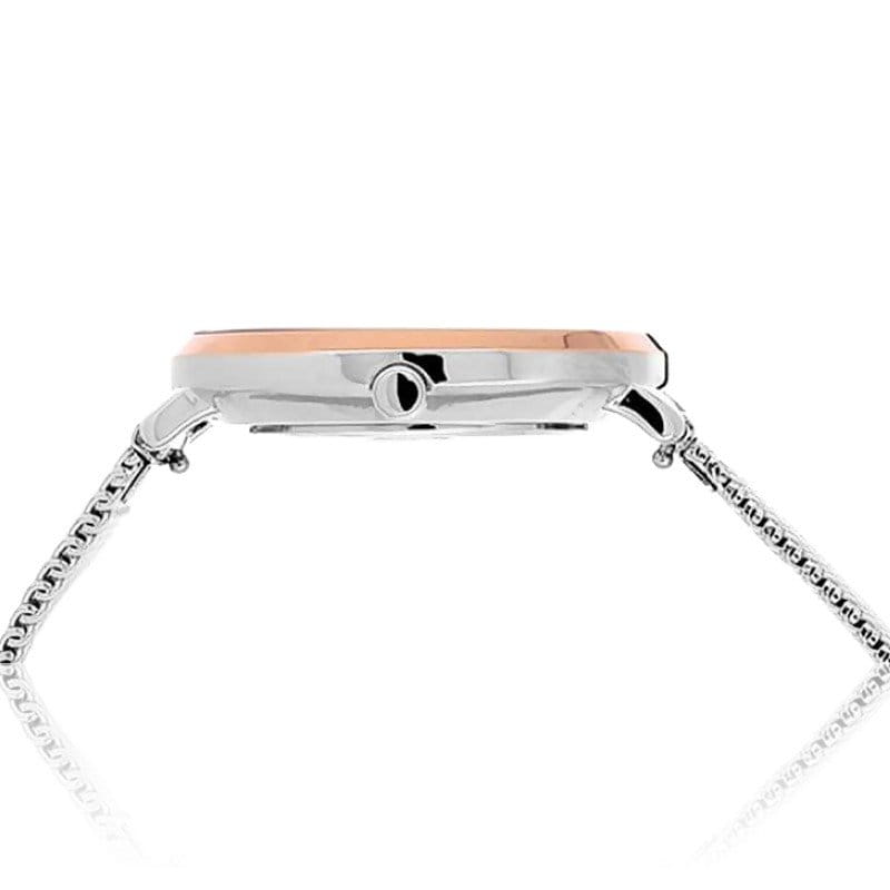 Кварцевые часы Водостойкость WR 50 Часы, минуты Корпус выполнен из нержавеющей стали c PVD покрытием Диаметр корпуса 33 мм Минеральное стекло Браслет миланского плетения, выполнен из нержавеющей стали Часы украшены кристаллами