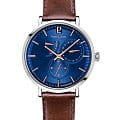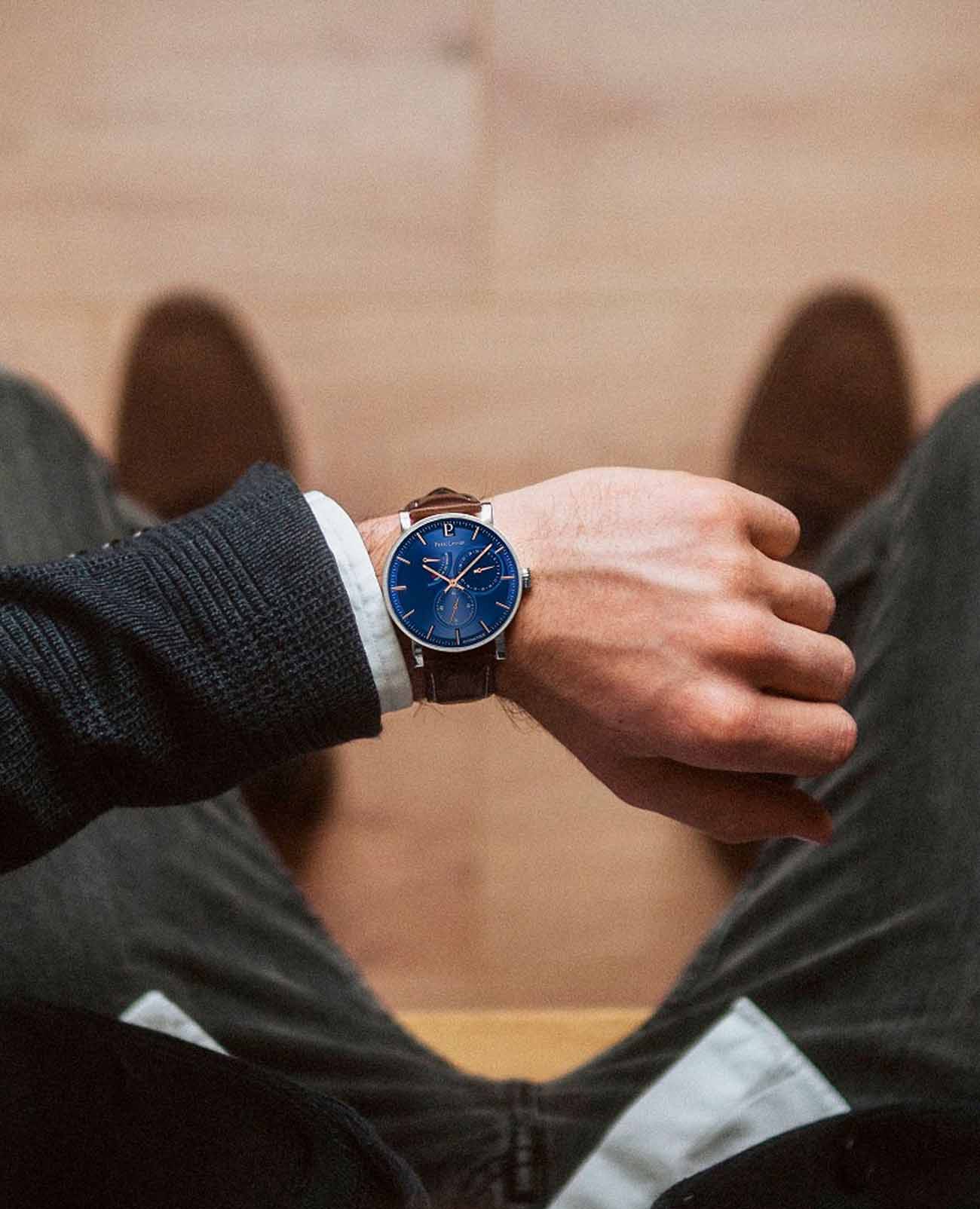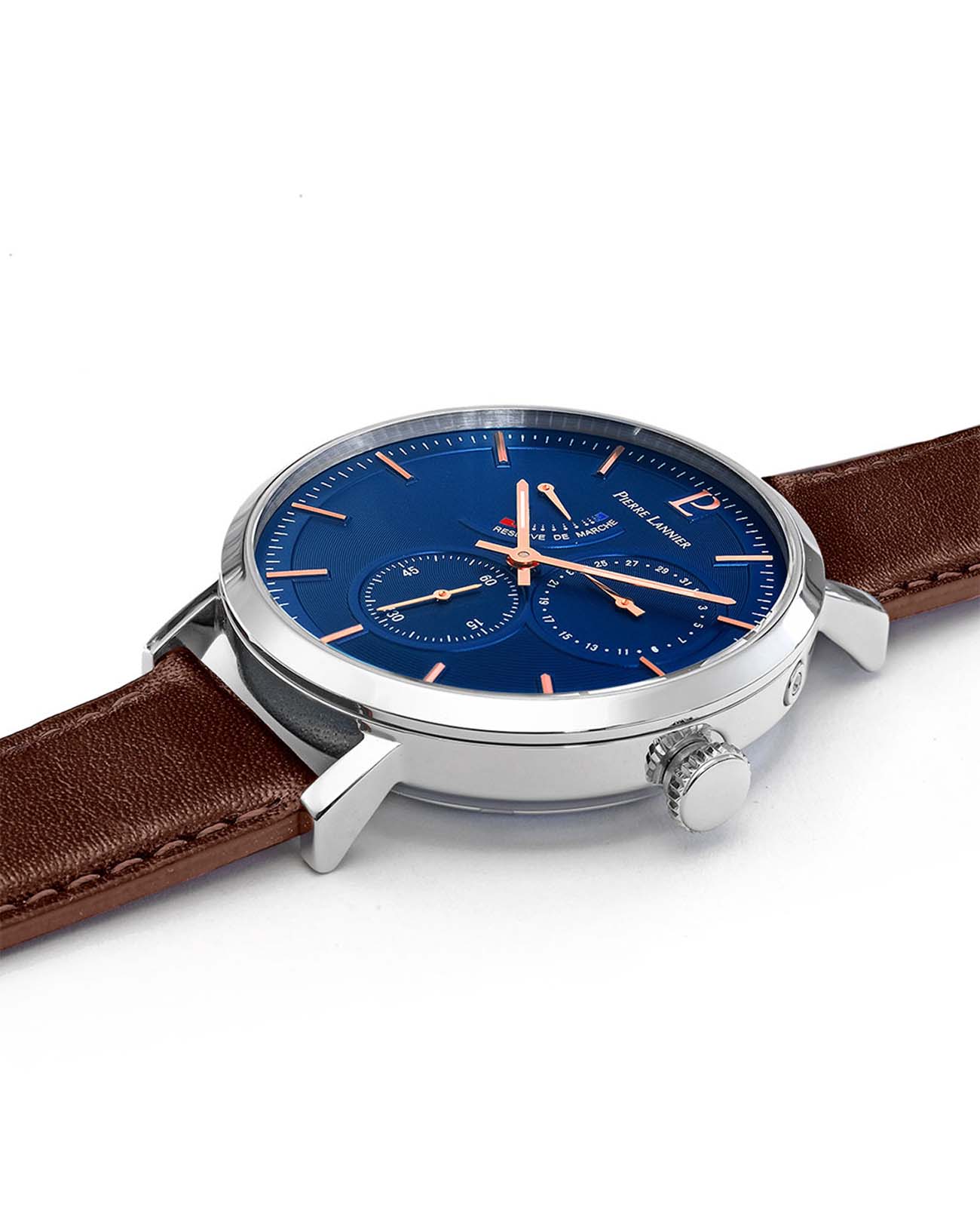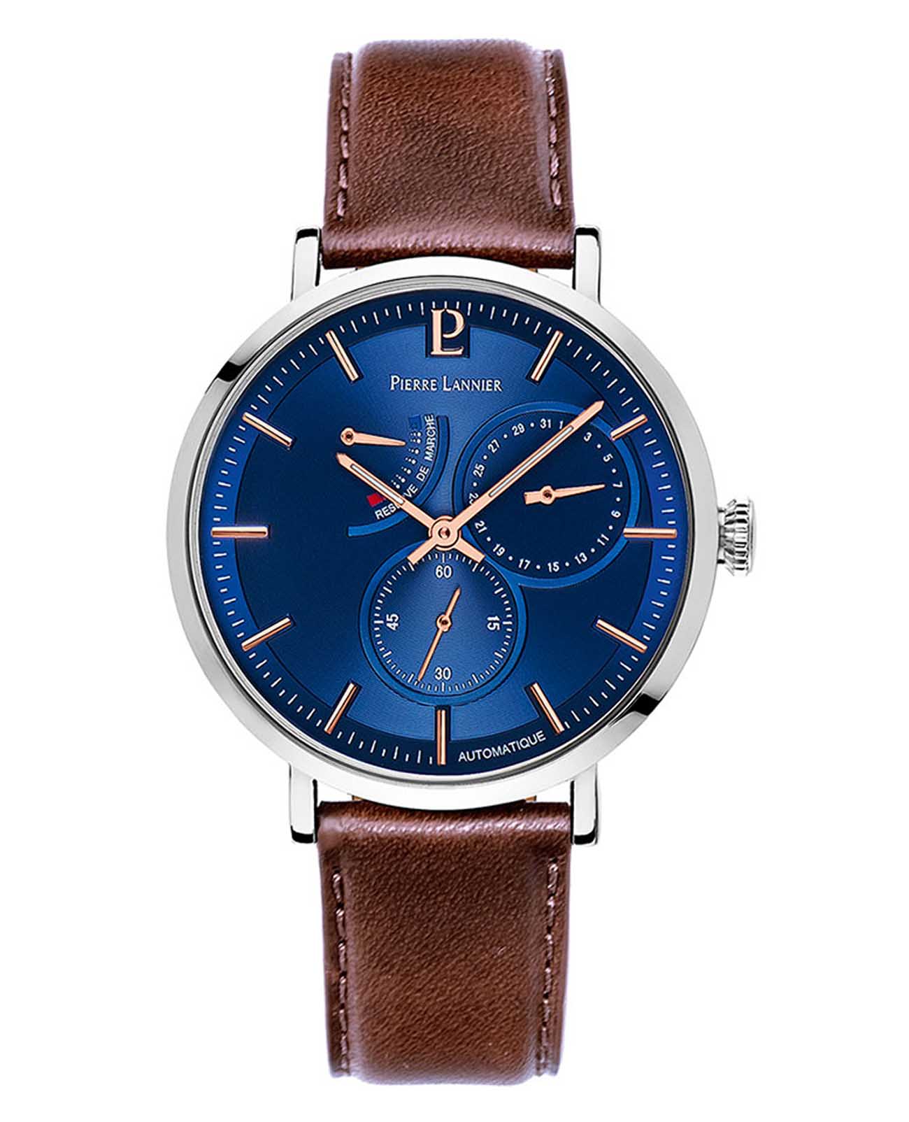 Мужские механические часы с автоподзаводом Pierre Lannier Evidence 327B164. Минеральное стеклоМинеральное стеклоМинеральное стекло представляет собой искусственно выращенный минерал кварца. Такое стекло отличается особой устойчивостью к повреждениям и царапинам. Уступает по некоторым качествам сапфировому стеклу. устойчивое к мелким механическим повреждениям. Корпус выполнен из нержавеющей стали. Центральные часовая и минутная стрелки, секундная стрелка вынесена на малый циферблат. Отображение даты в малом циферблате. Ретроградный индикатор запаса хода. Стрелки с люминесцентным покрытиемЛюминесцентное покрытиеПозволяет считывать показания времени в темноте. Производители наносят на стрелки, часовые индексы, безель или поверхность циферблата светонакопительный состав, дающий холодное свечение.. Класс водозащиты: 30 метров, позволит защитить корпус от случайных брызг или капель дождя. Кожаный ремешок на стандартной застёжке.