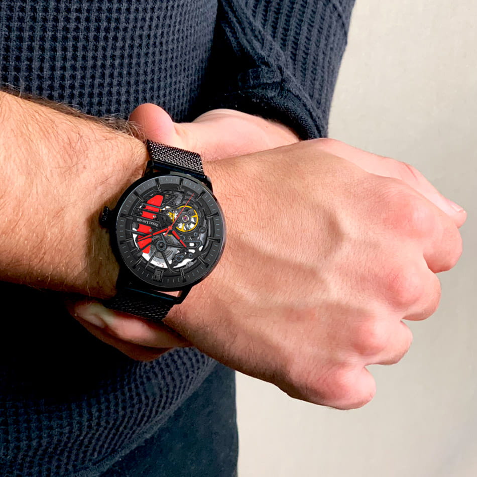 Мужские механические часы с автоподзаводом Pierre Lannier Paddock 338A439. Минеральное стеклоМинеральное стеклоМинеральное стекло представляет собой искусственно выращенный минерал кварца. Такое стекло отличается особой устойчивостью к повреждениям и царапинам. Уступает по некоторым качествам сапфировому стеклу. устойчивое к мелким механическим повреждениям. Центральные часовая, минутная и секундная стрелки. Корпус выполнен из нержавеющей стали с IP-покрытиемIP-покрытиеМетод ионного напыления. Демонстрирует повышенную устойчивость к истиранию, окислению и химическим веществам. Под воздействием высокого давления и температуры около 1500°C молекулы металла надёжно соединяются с частицами корпуса часов.. Водостойкость: 50 метров, позволит защитить корпус от случайных брызг или капель дождя. Стальной браслет миланского плетения с раскладной застёжкойРаскладная застёжкаТакой тип застёжки используется только на браслетах из металла. Она никогда не раскрывается полностью, происходит разделение на 2 и более частей. Раскладывающая застёжка снизит вероятность потери часов к минимуму.. Черный скелетонизированный циферблат.