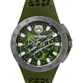 Дерзкий аксессуар со смелым, бунтарским дизайном будет с вами в любом приключении. Мужские часы-хронографХронографФункция позволяет измерять отрезки времени с особой точностью: часы, минуты, секунды. Верным признаком хронографа является наличие на циферблате 3 дополнительных окошек-счётчиков. с секундомеромСекундомерСекундоме́р — прибор, способный измерять интервалы времени с точностью до долей секунды. с тахиметромТахиметрРазмеченная шкала, располагается на ободке или безеле часов. Тахиметр позволяет рассчитать скорость на определённом участке пути, расстояние измеряется в километрах или милях.. Корпус часов изотовлен из нержавеющей стали с IP-покрытиемIP-покрытиеМетод ионного напыления. Демонстрирует повышенную устойчивость к истиранию, окислению и химическим веществам. Под воздействием высокого давления и температуры около 1500°C молекулы металла надёжно соединяются с частицами корпуса часов.. Циферблат с камуфляжным рисунком дополнен паттерном ''след когтей''. Метки в виде штрихов, фирменное лого в виде тигра в положении 12 часов. Окошко даты находится между часовыми метками 4 и 5. Рифленая заводная головка с защитой. Класс водозащиты: 50 метров, позволит защитить корпус от случайных брызг или капель дождя. Силиконовый ремешок на стандартной застежке.