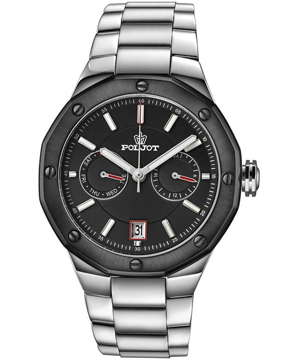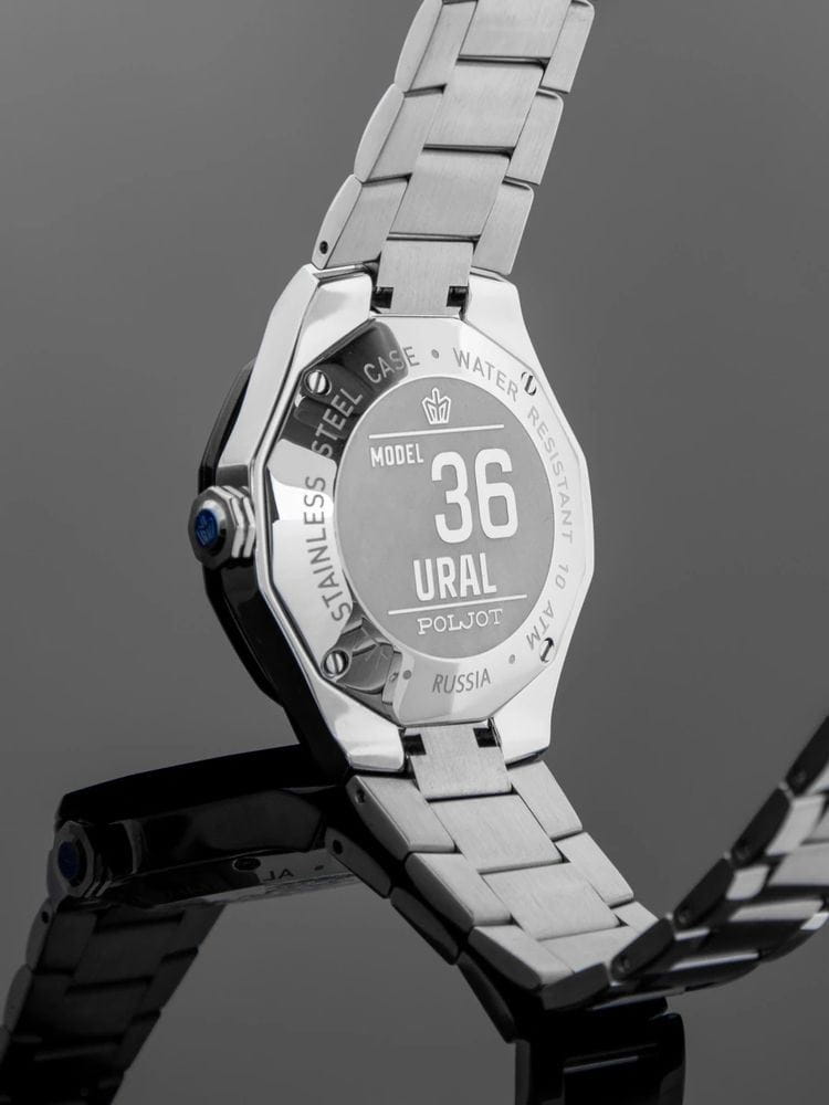 Poljot Ural JP21.363267Б — стильные кварцевые часы, сочетающие брутальный характер и современную элегантность. Корпус выполнен из нержавеющей стали, что придаёт модели монолитность и прочность, а глубокий циферблат подчеркивает премиальный облик. БезельБезельВнешний ободок, закрепляющий стекло. В спортивных часах так называется поворотное кольцо с делениями на циферблате, выполняет роль таймера – замеряет отрезки времени на шкале. Неподвижный безель – элемент декора. Однонаправленно вращающийся безель на дайверских часах позволяет фиксировать моменты погружения и выныривания на поверхность. с PVD-покрытиемPVDУльтратонкое покрытие наносится в технике вакуумного напыления, сочетает в себе нитрид титана особой прочности со слоем золота или оксида хрома. Несёт в себе декоративную или защитную функцию.. Стальной браслет на застёжке-бабочке с кнопкамиЗастёжка "бабочка"Такой вид застёжки дополняется предохранителями, помогающими избежать случайного раскрытия браслета. Обладают изящным исполнением. . Внутри установлен надёжный кварцевый механизм, обеспечивающий точный ход и плавную работу стрелок. Широкие метки и стрелки с люминесцентным покрытиемЛюминесцентное покрытиеПозволяет считывать показания времени в темноте. Производители наносят на стрелки, часовые индексы, безель или поверхность циферблата светонакопительный состав, дающий холодное свечение. гарантируют превосходную читаемость в любое время суток, а окно даты добавляет удобства. Прочное минеральное стеклоМинеральное стеклоМинеральное стекло представляет собой искусственно выращенный минерал кварца. Такое стекло отличается особой устойчивостью к повреждениям и царапинам. Уступает по некоторым качествам сапфировому стеклу. защищает циферблат от повреждений, а водонепроницаемость до 10 бар делает часы надёжным спутником как в деловом, так и активном образе жизни. Poljot Ural — воплощение силы, точности и мужского стиля, созданное для тех, кто ценит механику и уверенность в каждой детали.