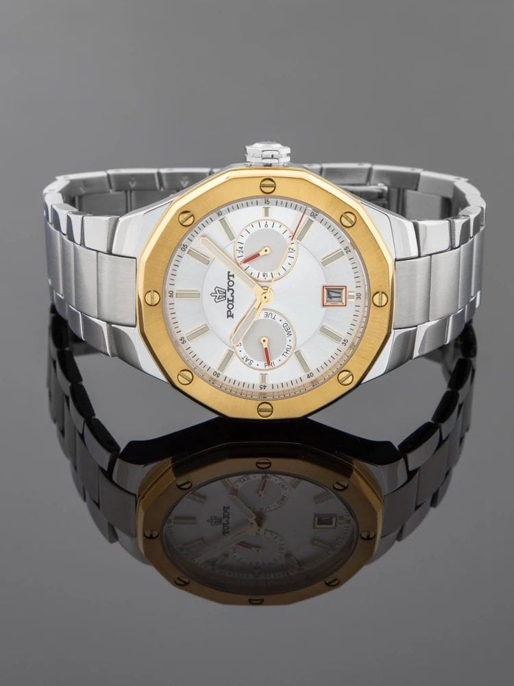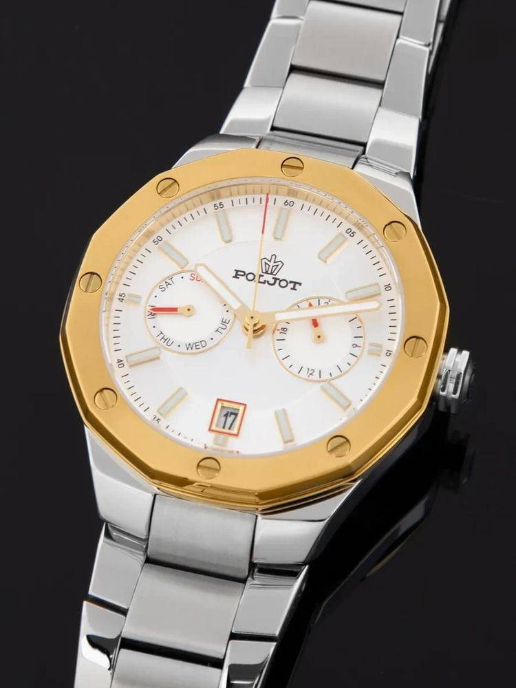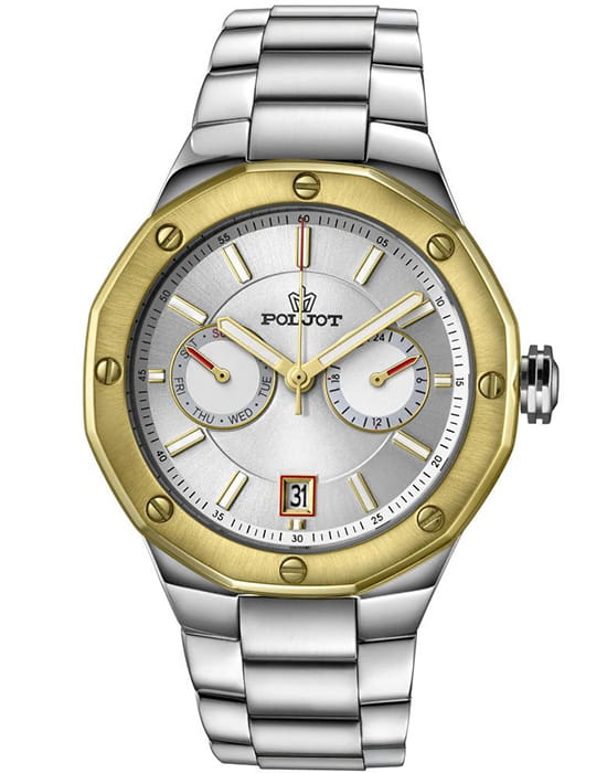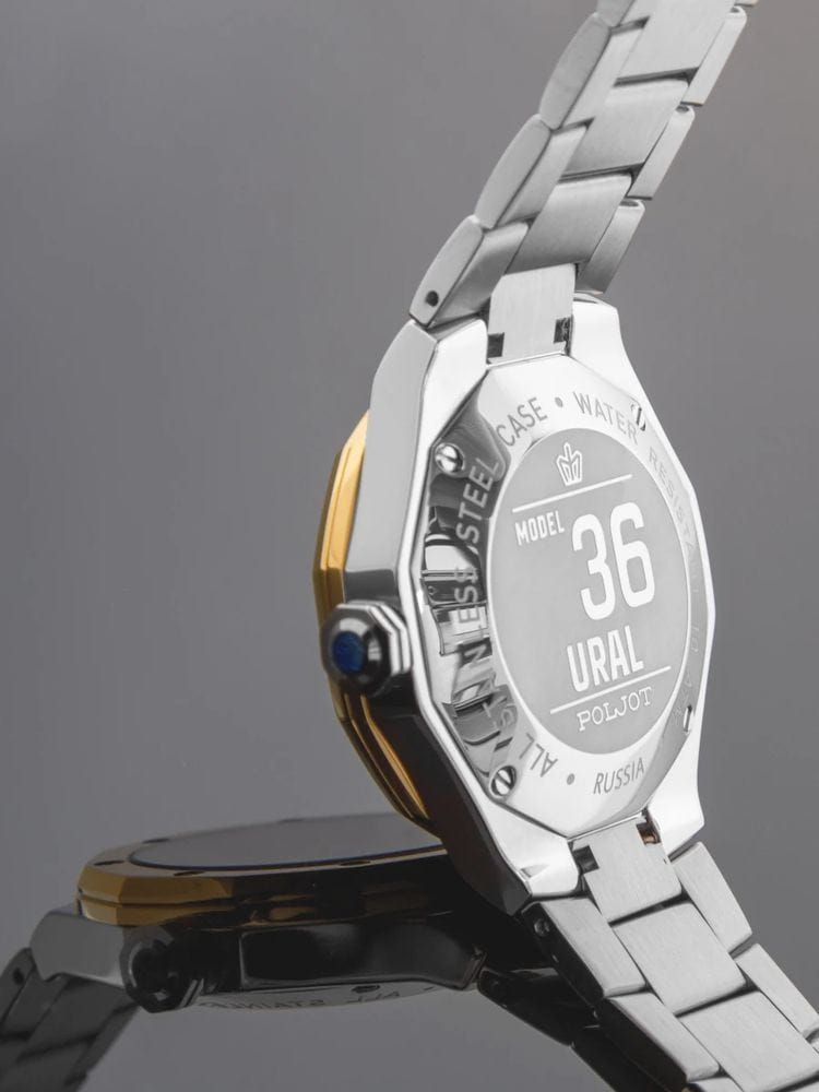 Poljot Ural JP21.365268Б — стильные кварцевые часы, сочетающие брутальный характер и современную элегантность. Корпус выполнен из нержавеющей стали, что придаёт модели монолитность и прочность, а глубокий циферблат подчеркивает премиальный облик. БезельБезельВнешний ободок, закрепляющий стекло. В спортивных часах так называется поворотное кольцо с делениями на циферблате, выполняет роль таймера – замеряет отрезки времени на шкале. Неподвижный безель – элемент декора. Однонаправленно вращающийся безель на дайверских часах позволяет фиксировать моменты погружения и выныривания на поверхность. с PVD-покрытиемPVDУльтратонкое покрытие наносится в технике вакуумного напыления, сочетает в себе нитрид титана особой прочности со слоем золота или оксида хрома. Несёт в себе декоративную или защитную функцию.. Стальной браслет на застёжке-бабочке с кнопкамиЗастёжка "бабочка"Такой вид застёжки дополняется предохранителями, помогающими избежать случайного раскрытия браслета. Обладают изящным исполнением. . Внутри установлен надёжный кварцевый механизм, обеспечивающий точный ход и плавную работу стрелок. Широкие метки и стрелки с люминесцентным покрытиемЛюминесцентное покрытиеПозволяет считывать показания времени в темноте. Производители наносят на стрелки, часовые индексы, безель или поверхность циферблата светонакопительный состав, дающий холодное свечение. гарантируют превосходную читаемость в любое время суток, а окно даты добавляет удобства. Прочное минеральное стеклоМинеральное стеклоМинеральное стекло представляет собой искусственно выращенный минерал кварца. Такое стекло отличается особой устойчивостью к повреждениям и царапинам. Уступает по некоторым качествам сапфировому стеклу. защищает циферблат от повреждений, а водонепроницаемость до 10 бар делает часы надёжным спутником как в деловом, так и активном образе жизни. Poljot Ural — воплощение силы, точности и мужского стиля, созданное для тех, кто ценит механику и уверенность в каждой детали.