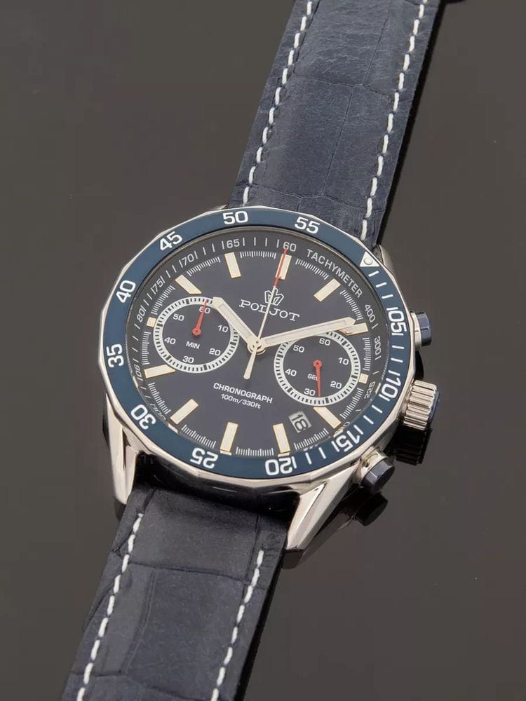 Poljot 6S21.181257 — яркие мужские часы с выразительным спортивным характером и акцентом на функциональность. Корпус из нержавеющей стали придаёт модели надёжность и солидность, а насыщенный циферблат с контрастными счётчиками хронографаХронографФункция позволяет измерять отрезки времени с особой точностью: часы, минуты, секунды. Верным признаком хронографа является наличие на циферблате 3 дополнительных окошек-счётчиков. создаёт динамичный и энергичный облик. БезельБезельВнешний ободок, закрепляющий стекло. В спортивных часах так называется поворотное кольцо с делениями на циферблате, выполняет роль таймера – замеряет отрезки времени на шкале. Неподвижный безель – элемент декора. Однонаправленно вращающийся безель на дайверских часах позволяет фиксировать моменты погружения и выныривания на поверхность. с PVD-покрытиемPVDУльтратонкое покрытие наносится в технике вакуумного напыления, сочетает в себе нитрид титана особой прочности со слоем золота или оксида хрома. Несёт в себе декоративную или защитную функцию.. Широкие стрелки и метки с люминесцентным покрытиемЛюминесцентное покрытиеПозволяет считывать показания времени в темноте. Производители наносят на стрелки, часовые индексы, безель или поверхность циферблата светонакопительный состав, дающий холодное свечение. обеспечивают отличную читаемость в любых условиях, а внешний обод с минутной шкалой подчёркивает спортивный стиль. Окно даты добавляет практичности. Прочное минеральное стеклоМинеральное стеклоМинеральное стекло представляет собой искусственно выращенный минерал кварца. Такое стекло отличается особой устойчивостью к повреждениям и царапинам. Уступает по некоторым качествам сапфировому стеклу. надёжно защищает циферблат от повреждений, а ремешок из натуральной кожи гармонично дополняет контрастную цветовую палитру. Poljot — это смелое сочетание спортивной энергии, точности и современного дизайна для активного и уверенного мужчины.