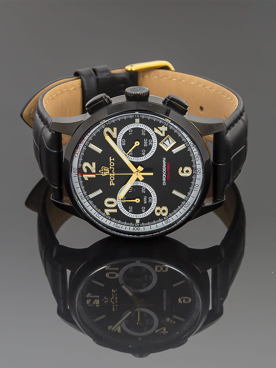 Poljot 6S21.904216 — современные мужские часы с выразительным спортивным дизайном и надёжной функциональностью. Корпус из нержавеющей стали с с PVD-покрытиемPVDУльтратонкое покрытие наносится в технике вакуумного напыления, сочетает в себе нитрид титана особой прочности со слоем золота или оксида хрома. Несёт в себе декоративную или защитную функцию. подчёркивает прочность и уверенный характер модели, а глубокий циферблат с счётчиками хронографаХронографФункция позволяет измерять отрезки времени с особой точностью: часы, минуты, секунды. Верным признаком хронографа является наличие на циферблате 3 дополнительных окошек-счётчиков. и аккуратным окном даты придаёт часам динамичный вид. Контрастные стрелки и метки с люминесцентным покрытиемЛюминесцентное покрытиеПозволяет считывать показания времени в темноте. Производители наносят на стрелки, часовые индексы, безель или поверхность циферблата светонакопительный состав, дающий холодное свечение. обеспечивают удобство считывания информации в любое время суток, а внешняя шкала тахиметраТахиметрРазмеченная шкала, располагается на ободке или безеле часов. Тахиметр позволяет рассчитать скорость на определённом участке пути, расстояние измеряется в километрах или милях. добавляет спортивную функциональность. Прочное минеральное стеклоМинеральное стеклоМинеральное стекло представляет собой искусственно выращенный минерал кварца. Такое стекло отличается особой устойчивостью к повреждениям и царапинам. Уступает по некоторым качествам сапфировому стеклу. защищает циферблат от царапин, а ремешок из натуральной кожи гарантирует комфорт и элегантную посадку на запястье. Poljot — это гармония классики и спортивного духа, созданная для мужчин, ценящих точность, надёжность и уверенный стиль.