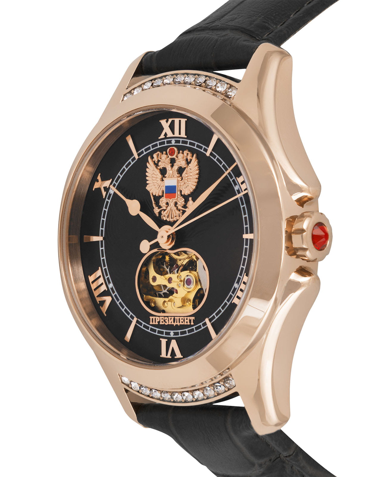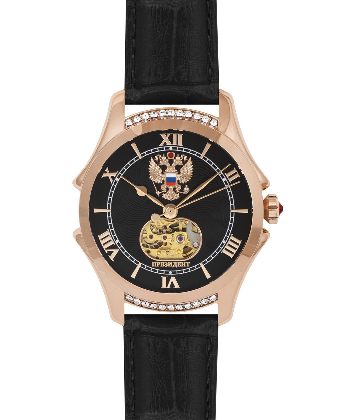 Стильные элегантные часы «Президент» — это идеальное дополнение к образу уверенной и целеустремлённой женщины. Модель выполнена в круглой форме с корпусом диаметром 39 мм и толщиной 11 мм, украшенным розовым золотом18-каратное золотоОбозначение по каратной системе пробирования, оно показывает, сколько драгоценного металла содержится в изделии. 18 карат - в составе 75% чистого золота, соответствует 750 пробе.