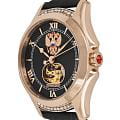 , что придаёт ей благородный внешний вид и устойчивость к царапинам. Циферблат чёрного цвета с открытым окном баланса и инкрустирован кристаллами Swarovski, подчёркивающими изысканность и внимание к деталям. Защиту циферблата обеспечивает минеральное стеклоМинеральное стеклоМинеральное стекло представляет собой искусственно выращенный минерал кварца. Такое стекло отличается особой устойчивостью к повреждениям и царапинам. Уступает по некоторым качествам сапфировому стеклу., устойчивое к повседневным нагрузкам и обеспечивающее хорошую прозрачность. Часы оснащены механизмом с автоподзаводом, разработанным японской компанией Miyota, что гарантирует точность и надёжность. Кожаный ремешок шириной 18 мм дополнен стандартной застёжкой, обеспечивающей комфорт и удобство при ношении. Водонепроницаемость позволяет использовать часы в условиях случайных брызг или капель дождя. Эти часы станут универсальным аксессуаром для тех, кто ценит сочетание стиля, качества и элегантности — идеальный выбор для женщин, которые следят за своим имиджем и предпочитают выделяться.