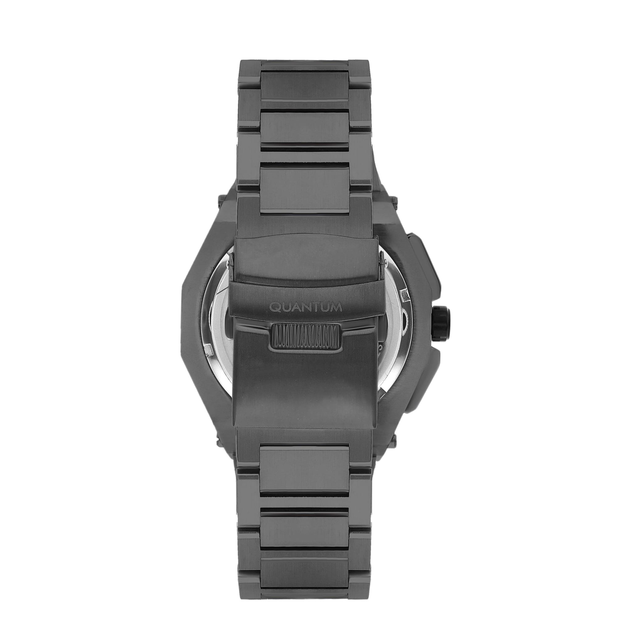 Мужские наручные часы-хронографХронографФункция позволяет измерять отрезки времени с особой точностью: часы, минуты, секунды. Верным признаком хронографа является наличие на циферблате 3 дополнительных окошек-счётчиков. Quantum HNG1011.090, кварцевый механизм с высокой точностью. Класс водозащиты: 100 метров, позволит плавать, нырять и заниматься другими водными видами спорта. Корпус часов изготовлен из стали с PVD-покрытиемPVDУльтратонкое покрытие наносится в технике вакуумного напыления, сочетает в себе нитрид титана особой прочности со слоем золота или оксида хрома. Несёт в себе декоративную или защитную функцию.. Стрелки с люминесцентным покрытиемЛюминесцентное покрытиеПозволяет считывать показания времени в темноте. Производители наносят на стрелки, часовые индексы, безель или поверхность циферблата светонакопительный состав, дающий холодное свечение.. Стальной браслет с PVD-покрытиемPVDУльтратонкое покрытие наносится в технике вакуумного напыления, сочетает в себе нитрид титана особой прочности со слоем золота или оксида хрома. Несёт в себе декоративную или защитную функцию. на раскладной застёжкеРаскладная застёжкаТакой тип застёжки используется только на браслетах из металла. Она никогда не раскрывается полностью, происходит разделение на 2 и более частей. Раскладывающая застёжка снизит вероятность потери часов к минимуму..