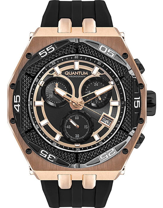 Мужские наручные часы-хронографХронографФункция позволяет измерять отрезки времени с особой точностью: часы, минуты, секунды. Верным признаком хронографа является наличие на циферблате 3 дополнительных окошек-счётчиков. Quantum HNG1066.851, кварцевый механизм с высокой точностью. Минеральное стеклоМинеральное стеклоМинеральное стекло представляет собой искусственно выращенный минерал кварца. Такое стекло отличается особой устойчивостью к повреждениям и царапинам. Уступает по некоторым качествам сапфировому стеклу. устойчивое к появлению царапин, обладающее высокой прозрачностью. Класс водозащиты: 100 метров, позволит плавать, нырять и заниматься другими водными видами спорта. Корпус часов изготовлен из стали с PVD-покрытиемPVDУльтратонкое покрытие наносится в технике вакуумного напыления, сочетает в себе нитрид титана особой прочности со слоем золота или оксида хрома. Несёт в себе декоративную или защитную функцию.. Стрелки и метки с люминесцентным покрытиемЛюминесцентное покрытиеПозволяет считывать показания времени в темноте. Производители наносят на стрелки, часовые индексы, безель или поверхность циферблата светонакопительный состав, дающий холодное свечение.. Каучуковый ремешок.