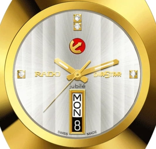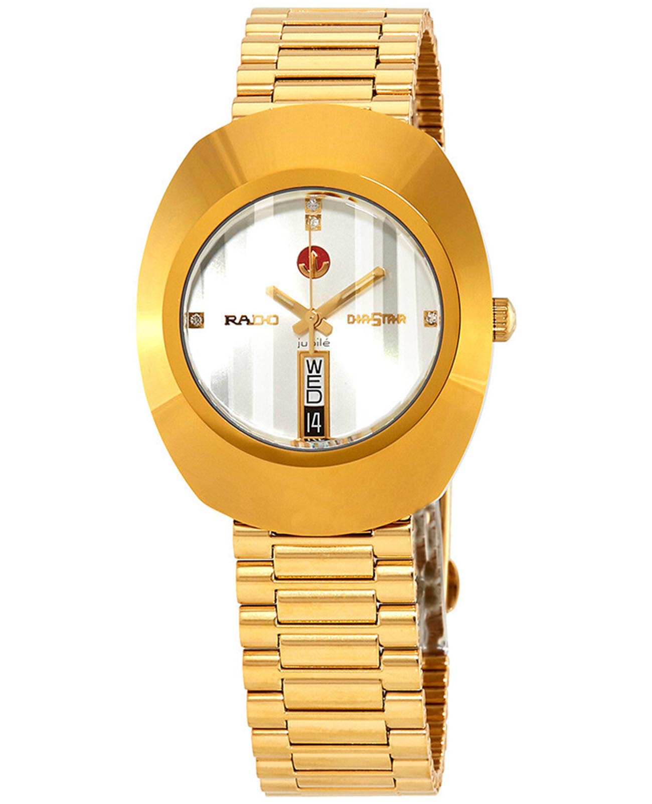 Мужские часы Rado The Original Automatic R12413783 с надёжным автоматическим механизмом. Корпус и браслет часов выполнены из нержавеющей стали c PVD-покрытиемPVDУльтратонкое покрытие наносится в технике вакуумного напыления, сочетает в себе нитрид титана особой прочности со слоем золота или оксида хрома. Несёт в себе декоративную или защитную функцию.. Браслет на раскладной застёжкеРаскладная застёжкаТакой тип застёжки используется только на браслетах из металла. Она никогда не раскрывается полностью, происходит разделение на 2 и более частей. Раскладывающая застёжка снизит вероятность потери часов к минимуму.. Класс водозащиты: 30 метров, позволит защитить корпус от случайных брызг или капель дождя. Окошко даты и дня недели находится в положении 6 часов. Стрелки и метки с люминесцентным покрытиемЛюминесцентное покрытиеПозволяет считывать показания времени в темноте. Производители наносят на стрелки, часовые индексы, безель или поверхность циферблата светонакопительный состав, дающий холодное свечение.. Циферблат выполнен с метками в виде бриллиантов.
