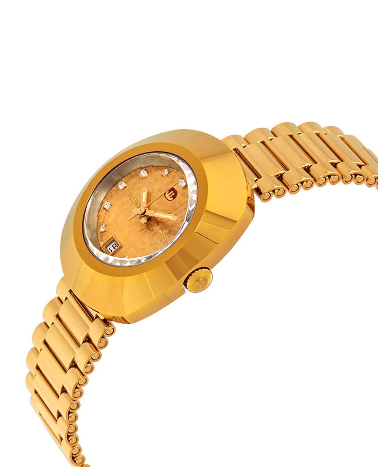 Женские механические швейцарские часы с автоподзаводом Rado The Original R12416643, кварцевый механизм с высокой точностью. Сапфировое стеклоСапфировое стеклоПрочный и надёжный материал из кристалла сапфира синтетического происхождения, характеризующийся особой твёрдостью и устойчивостью к царапинам и повреждениям. устойчивое к появлению царапин, обладающее высокой прозрачностью. Корпус и браслет часов выполнены из нержавеющей стали c PVD-покрытиемPVDУльтратонкое покрытие наносится в технике вакуумного напыления, сочетает в себе нитрид титана особой прочности со слоем золота или оксида хрома. Несёт в себе декоративную или защитную функцию.. Циферблат инкрустирован кристаллами. Класс водозащиты: 30 метров, позволит защитить корпус от случайных брызг или капель дождя. Браслет на раскладной застёжкеРаскладная застёжкаТакой тип застёжки используется только на браслетах из металла. Она никогда не раскрывается полностью, происходит разделение на 2 и более частей. Раскладывающая застёжка снизит вероятность потери часов к минимуму..