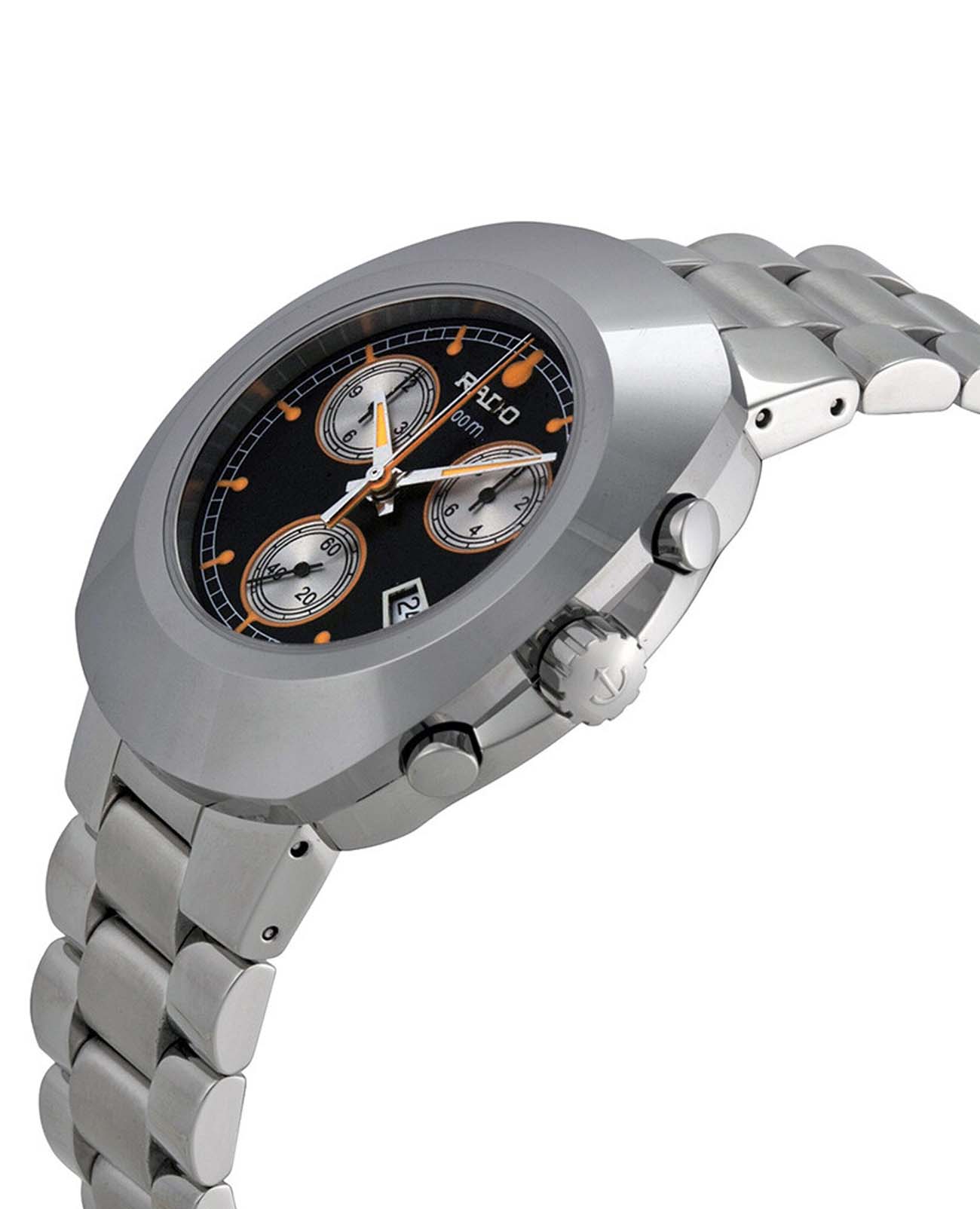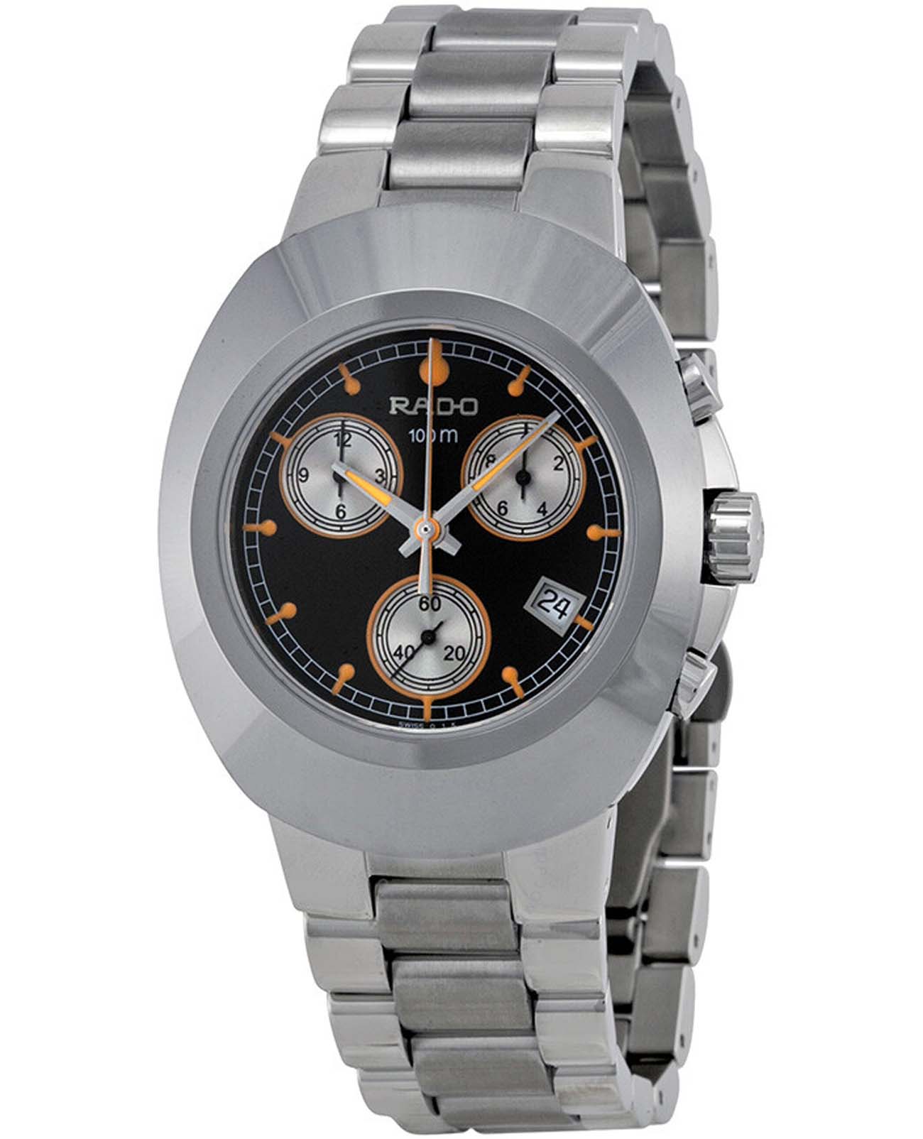 Мужские швейцарские часы-хронографХронографФункция позволяет измерять отрезки времени с особой точностью: часы, минуты, секунды. Верным признаком хронографа является наличие на циферблате 3 дополнительных окошек-счётчиков. Rado DiaStar Original R12638153. Сапфировое стеклоСапфировое стеклоПрочный и надёжный материал из кристалла сапфира синтетического происхождения, характеризующийся особой твёрдостью и устойчивостью к царапинам и повреждениям. устойчивое к мелким механическим повреждениям. Корпус часов изготовлен из высокотехнологичной керамикиВысокотехнологичная керамикаИнновационный запатентованный Rado материал с гладкой или матовой поверхностью. Керамика за счёт кристаллической структуры обладает повышенной устойчивостью от возникновения царапин. Материал способен принимать температуру тела человека, обеспечивая невероятный комфорт при ношении.. Класс водозащиты: 30 метров, позволит защитить корпус от случайных брызг или капель дождя. Браслет из нержавеющей стали на раскладной застёжкеРаскладная застёжкаТакой тип застёжки используется только на браслетах из металла. Она никогда не раскрывается полностью, происходит разделение на 2 и более частей. Раскладывающая застёжка снизит вероятность потери часов к минимуму..