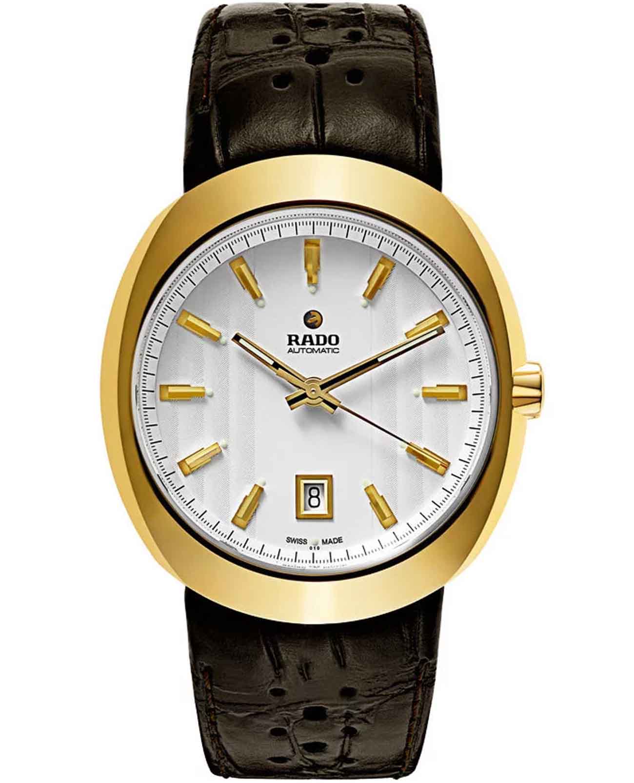 Мужские механические швейцарские часы Rado D-Star R15515105. Сапфировое стеклоСапфировое стеклоПрочный и надёжный материал из кристалла сапфира синтетического происхождения, характеризующийся особой твёрдостью и устойчивостью к царапинам и повреждениям. устойчивое к мелким механическим повреждениям. Корпус часов изготовлен из нержавеющей стали с PVD-покрытиемPVDУльтратонкое покрытие наносится в технике вакуумного напыления, сочетает в себе нитрид титана особой прочности со слоем золота или оксида хрома. Несёт в себе декоративную или защитную функцию.. Стрелки с люминесцентным покрытиемЛюминесцентное покрытиеПозволяет считывать показания времени в темноте. Производители наносят на стрелки, часовые индексы, безель или поверхность циферблата светонакопительный состав, дающий холодное свечение.. Окошко даты находится в положении 6 часов. Класс водозащиты: 100 метров, позволит плавать, нырять и заниматься другими водными видами спорта. Кожаный ремешок на раскладной застёжкеРаскладная застёжкаТакой тип застёжки используется только на браслетах из металла. Она никогда не раскрывается полностью, происходит разделение на 2 и более частей. Раскладывающая застёжка снизит вероятность потери часов к минимуму..