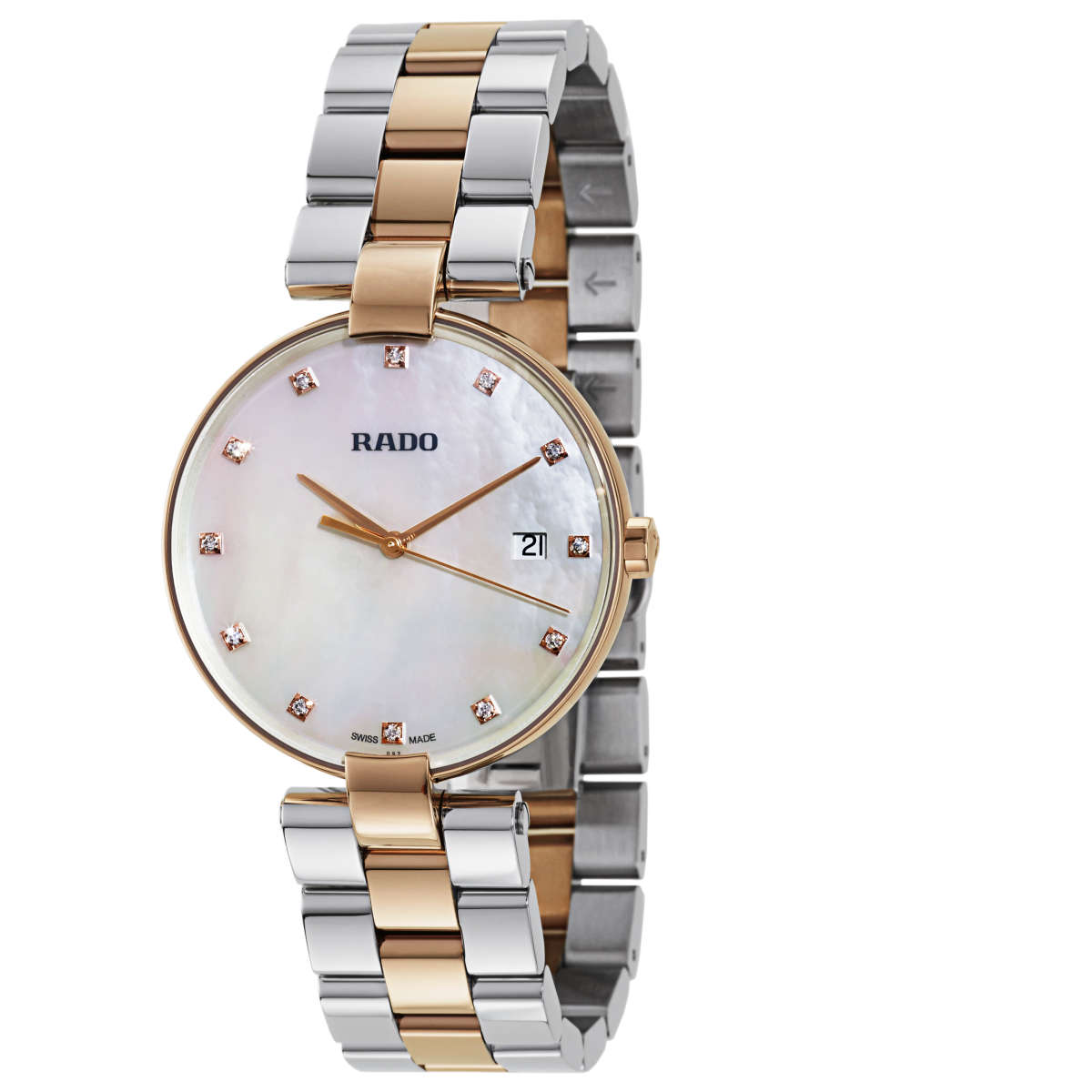 Мужские швейцарские наручные часы с надёжным кварцевым механизмом Rado Coupole R22853924. Корпус часов изготовлен из нержавеющей стали с PVD-покрытиемPVDУльтратонкое покрытие наносится в технике вакуумного напыления, сочетает в себе нитрид титана особой прочности со слоем золота или оксида хрома. Несёт в себе декоративную или защитную функцию.. Сапфировое стеклоСапфировое стеклоПрочный и надёжный материал из кристалла сапфира синтетического происхождения, характеризующийся особой твёрдостью и устойчивостью к царапинам и повреждениям. устойчивое к мелким механическим повреждениям. Стальной браслет с частичным PVD-покрытиемPVDУльтратонкое покрытие наносится в технике вакуумного напыления, сочетает в себе нитрид титана особой прочности со слоем золота или оксида хрома. Несёт в себе декоративную или защитную функцию. на застёжке-бабочке с кнопкамиЗастёжка "бабочка"Такой вид застёжки дополняется предохранителями, помогающими избежать случайного раскрытия браслета. Обладают изящным исполнением. . Класс водозащиты: 50 метров, позволит защитить корпус от случайных брызг или капель дождя. Окошко даты находится в положении 3 часа. Циферблат с 12 бриллиантами, весом: 0.085ct.