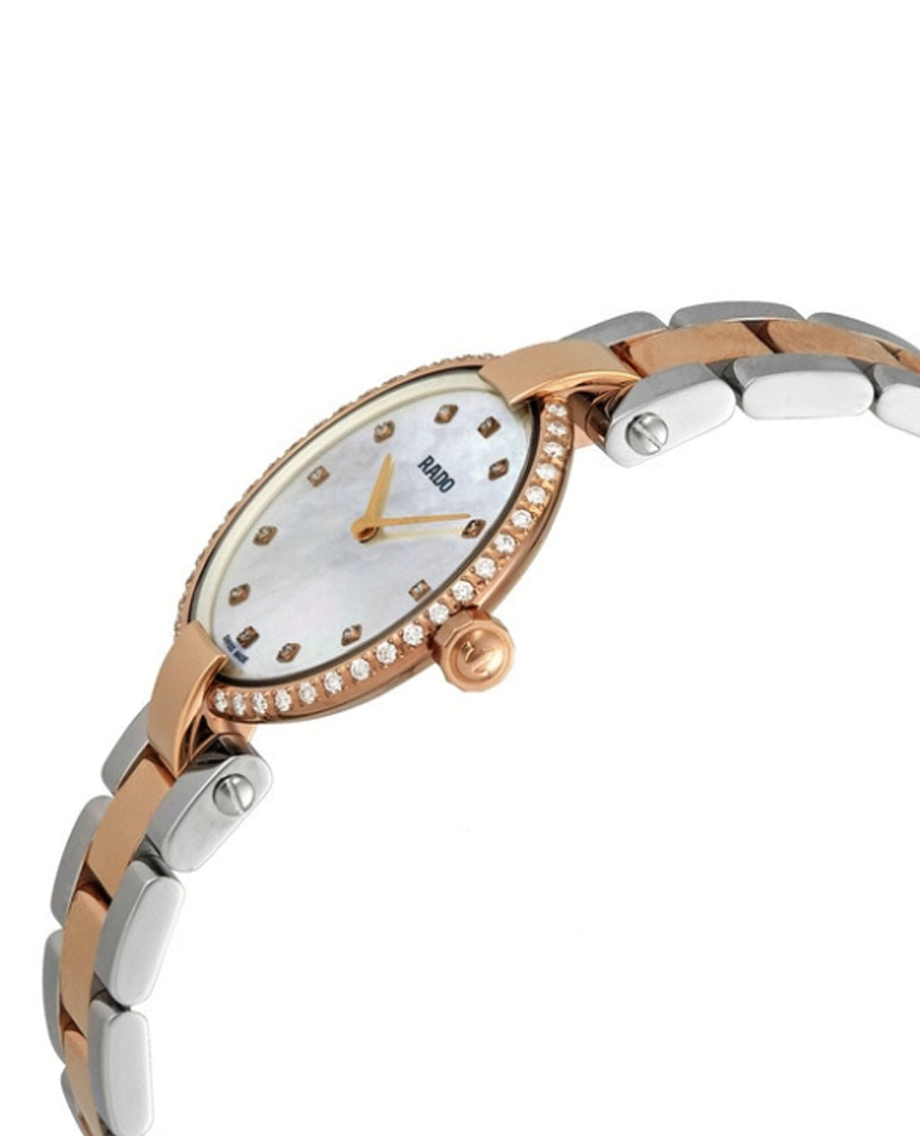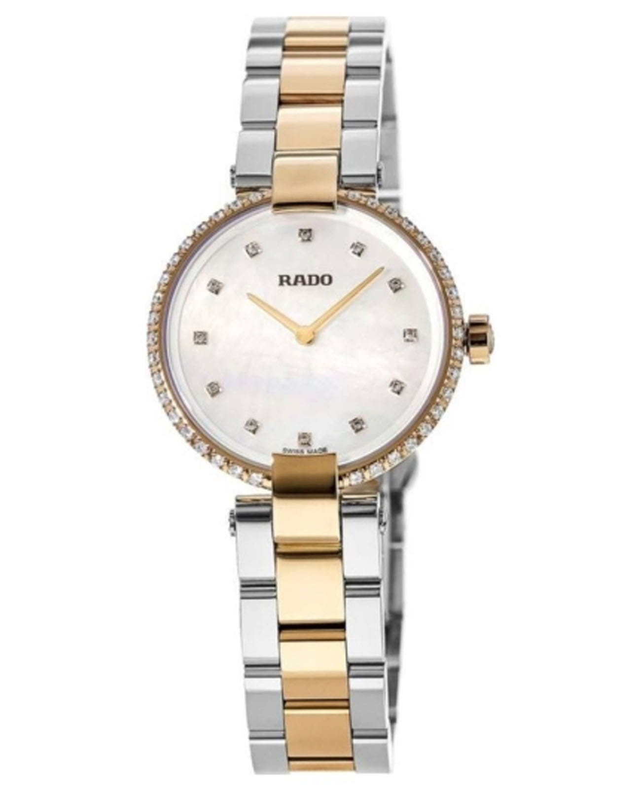 Швейцарские женские часы Rado Coupole Classic Diamonds R22859923, кварцевый механизм с высокой точностью. Сапфировое стеклоСапфировое стеклоПрочный и надёжный материал из кристалла сапфира синтетического происхождения, характеризующийся особой твёрдостью и устойчивостью к царапинам и повреждениям. устойчивое к появлению царапин, обладающее высокой прозрачностью. Корпус часов изготовлен из стали. БезельБезельВнешний ободок, закрепляющий стекло. В спортивных часах так называется поворотное кольцо с делениями на циферблате, выполняет роль таймера – замеряет отрезки времени на шкале. Неподвижный безель – элемент декора. Однонаправленно вращающийся безель на дайверских часах позволяет фиксировать моменты погружения и выныривания на поверхность. с PVD-покрытиемPVDУльтратонкое покрытие наносится в технике вакуумного напыления, сочетает в себе нитрид титана особой прочности со слоем золота или оксида хрома. Несёт в себе декоративную или защитную функцию. украшен бриллиантами. Класс водозащиты: 50 метров, позволит защитить корпус от случайных брызг или капель дождя. Стальной браслет с частичным PVD-покрытиемPVDУльтратонкое покрытие наносится в технике вакуумного напыления, сочетает в себе нитрид титана особой прочности со слоем золота или оксида хрома. Несёт в себе декоративную или защитную функцию. на застёжке-бабочке с кнопкамиЗастёжка "бабочка"Такой вид застёжки дополняется предохранителями, помогающими избежать случайного раскрытия браслета. Обладают изящным исполнением. .