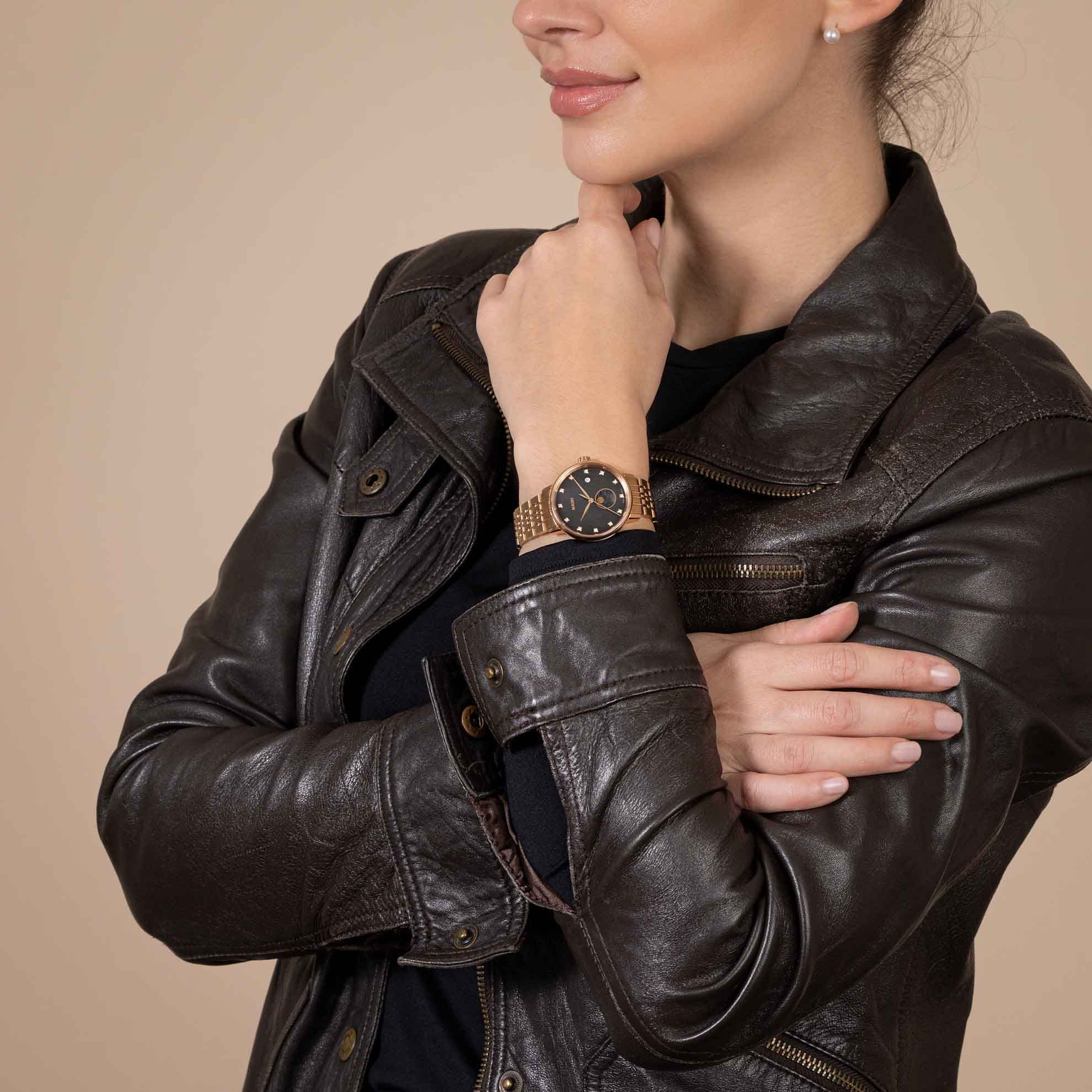 Женские кварцевые часы Rado — это элегантный аксессуар с изысканным дизайном. Корпус диаметром 34 мм и толщиной 9,7 мм выполнен из нержавеющей стали с PVD-покрытиемPVDУльтратонкое покрытие наносится в технике вакуумного напыления, сочетает в себе нитрид титана особой прочности со слоем золота или оксида хрома. Несёт в себе декоративную или защитную функцию. розового золота. БезельБезельВнешний ободок, закрепляющий стекло. В спортивных часах так называется поворотное кольцо с делениями на циферблате, выполняет роль таймера – замеряет отрезки времени на шкале. Неподвижный безель – элемент декора. Однонаправленно вращающийся безель на дайверских часах позволяет фиксировать моменты погружения и выныривания на поверхность. и заводная головка также выполнены с PVD-покрытиемPVDУльтратонкое покрытие наносится в технике вакуумного напыления, сочетает в себе нитрид титана особой прочности со слоем золота или оксида хрома. Несёт в себе декоративную или защитную функцию. и украшен бриллиантами. Механизм — кварцевый. Часы оснащены браслетом из нержавеющей стали с PVD-покрытиемPVDУльтратонкое покрытие наносится в технике вакуумного напыления, сочетает в себе нитрид титана особой прочности со слоем золота или оксида хрома. Несёт в себе декоративную или защитную функцию. розового золота и застёжкой «бабочка» с кнопкамиЗастёжка "бабочка"Такой вид застёжки дополняется предохранителями, помогающими избежать случайного раскрытия браслета. Обладают изящным исполнением. из титана и стали с PVD-покрытиемPVDУльтратонкое покрытие наносится в технике вакуумного напыления, сочетает в себе нитрид титана особой прочности со слоем золота или оксида хрома. Несёт в себе декоративную или защитную функцию.. Водонепроницаемость 50wr, что позволяет использовать часы под дождём. Универсальный выбор для тех, кто ценит стиль, качество и женственность.