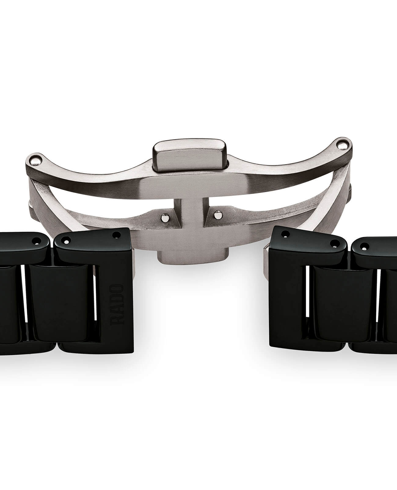 Премиальный аксессуар в чёрном цвете подойдет любителям удивлять окружающих, эксклюзивная модель может добавить уникальные черты любому образу. Часы скелетоны позволяют нам не только изучать движение частиц автоматического калибра ETA C07.631 с запасом хода 80 часов, но и полюбоваться безупречной отделкой деталей в технике жемчужного зернения. Модель выполнена из прочной высокотехнологичной керамикиВысокотехнологичная керамикаИнновационный запатентованный Rado материал с гладкой или матовой поверхностью. Керамика за счёт кристаллической структуры обладает повышенной устойчивостью от возникновения царапин. Материал способен принимать температуру тела человека, обеспечивая невероятный комфорт при ношении.. Сапфировое стекло имеет антибликовое покрытие. Водостойкость до 5 бар. Диаметр корпуса: 40 мм.