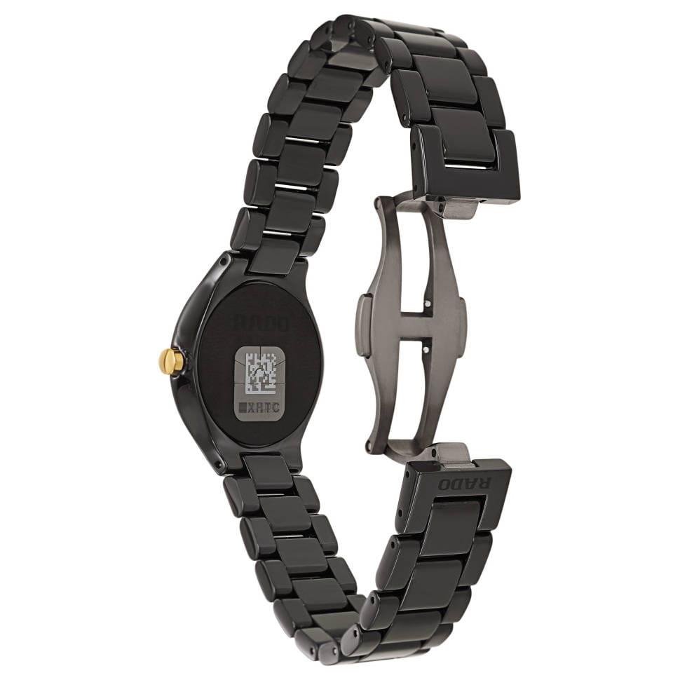 Чёрные наручные часы отличаются привлекательным металлическим блеском, однако при изготовлении не использовано ни грамма стали. Они сделаны из высокотехнологичной керамикиВысокотехнологичная керамикаИнновационный запатентованный Rado материал с гладкой или матовой поверхностью. Керамика за счёт кристаллической структуры обладает повышенной устойчивостью от возникновения царапин. Материал способен принимать температуру тела человека, обеспечивая невероятный комфорт при ношении., способной приобретать температурный режим кожи и обеспечивать комфортное ношение при любых условиях. Лаконичное исполнение позволяет использовать модель как изысканное дополнение к деловому или повседневному образу. Сапфировое стеклоСапфировое стеклоПрочный и надёжный материал из кристалла сапфира синтетического происхождения, характеризующийся особой твёрдостью и устойчивостью к царапинам и повреждениям.. Водозащита 30 метров. . Диаметр корпуса: 30 мм.