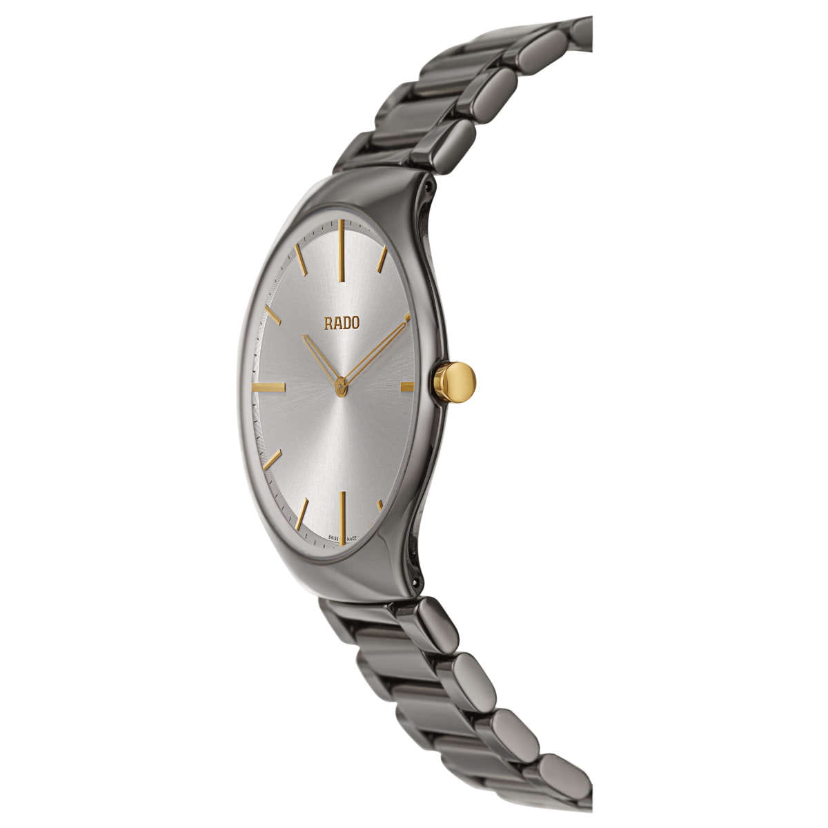 Швейцарские мужские Rado True Thinline R27955112, кварцевый механизм с высокой точностью. Сапфировое стеклоСапфировое стеклоПрочный и надёжный материал из кристалла сапфира синтетического происхождения, характеризующийся особой твёрдостью и устойчивостью к царапинам и повреждениям. устойчивое к появлению царапин, обладающее высокой прозрачностью. Корпус часов изготовлен из высокотехнологичной керамикиВысокотехнологичная керамикаИнновационный запатентованный Rado материал с гладкой или матовой поверхностью. Керамика за счёт кристаллической структуры обладает повышенной устойчивостью от возникновения царапин. Материал способен принимать температуру тела человека, обеспечивая невероятный комфорт при ношении.. Класс водозащиты: 30 метров, позволит защитить корпус от случайных брызг или капель дождя. Керамический браслет на застёжке-бабочке с кнопкамиЗастёжка "бабочка"Такой вид застёжки дополняется предохранителями, помогающими избежать случайного раскрытия браслета. Обладают изящным исполнением. .