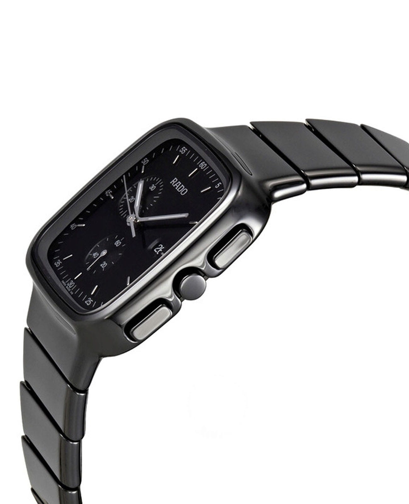 Мужские швейцарские часы-хронографХронографФункция позволяет измерять отрезки времени с особой точностью: часы, минуты, секунды. Верным признаком хронографа является наличие на циферблате 3 дополнительных окошек-счётчиков. Rado R5.5 R28885152. Сапфировое стеклоСапфировое стеклоПрочный и надёжный материал из кристалла сапфира синтетического происхождения, характеризующийся особой твёрдостью и устойчивостью к царапинам и повреждениям. устойчивое к мелким механическим повреждениям. Корпус часов изготовлен из высокотехнологичной керамикиВысокотехнологичная керамикаИнновационный запатентованный Rado материал с гладкой или матовой поверхностью. Керамика за счёт кристаллической структуры обладает повышенной устойчивостью от возникновения царапин. Материал способен принимать температуру тела человека, обеспечивая невероятный комфорт при ношении.. Класс водозащиты: 30 метров, позволит защитить корпус от случайных брызг или капель дождя. Браслет из высокотехнологичной керамикиВысокотехнологичная керамикаИнновационный запатентованный Rado материал с гладкой или матовой поверхностью. Керамика за счёт кристаллической структуры обладает повышенной устойчивостью от возникновения царапин. Материал способен принимать температуру тела человека, обеспечивая невероятный комфорт при ношении. на раскладной застёжкеРаскладная застёжкаТакой тип застёжки используется только на браслетах из металла. Она никогда не раскрывается полностью, происходит разделение на 2 и более частей. Раскладывающая застёжка снизит вероятность потери часов к минимуму..