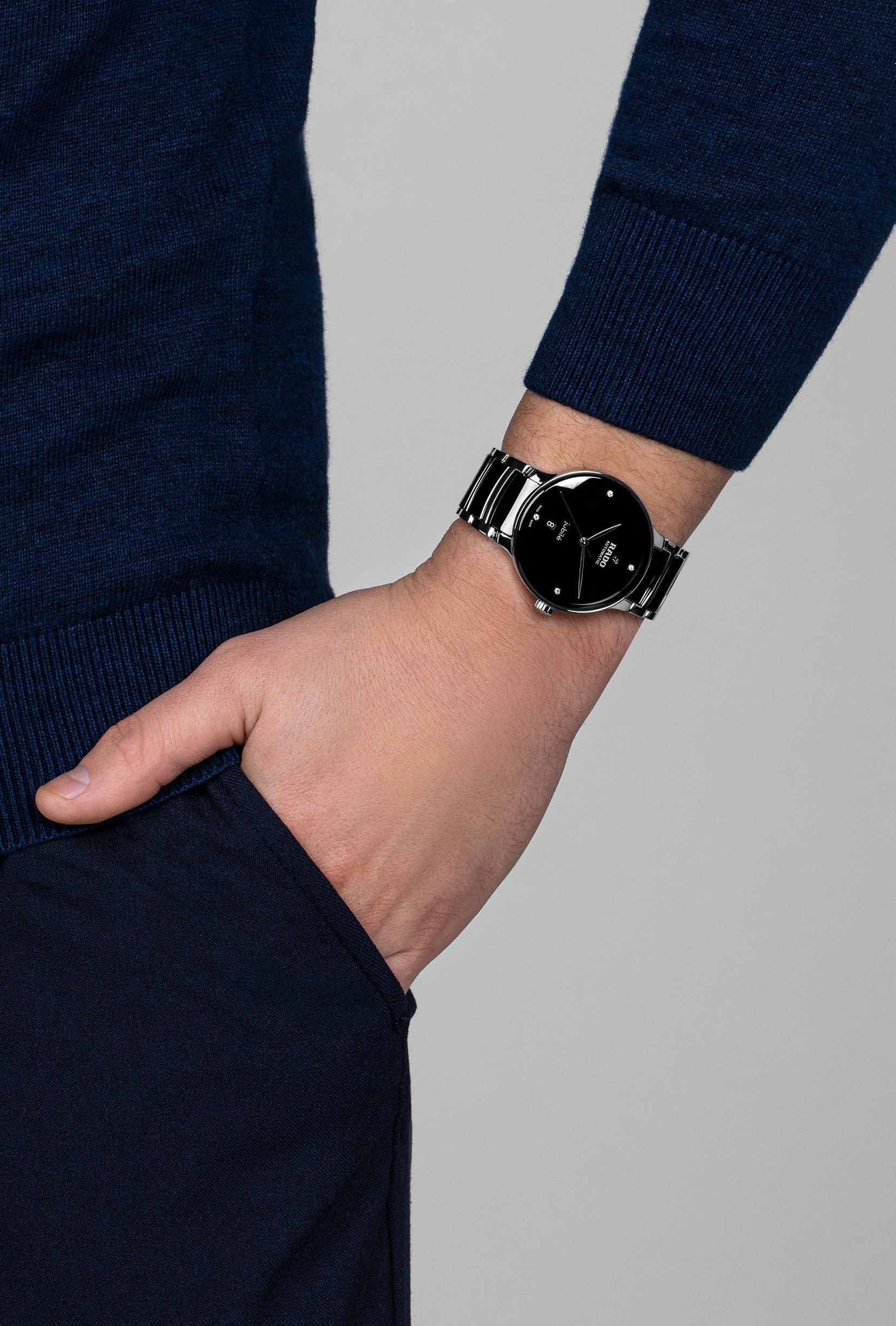 Аксессуар с чёрным циферблатом являет собой сочетание классической красоты и современного дизайна, отражающего минимализм. Его безупречная работа обеспечивается за счёт швейцарского автоматического механизма с 80-часовым запасом хода. Прозрачная задняя крышка позволяет прикоснуться к часовому искусству и понаблюдать за движением деталей. Сапфировое стеклоСапфировое стеклоПрочный и надёжный материал из кристалла сапфира синтетического происхождения, характеризующийся особой твёрдостью и устойчивостью к царапинам и повреждениям.. Браслет из нержавеющей стали и высокотехнологичной плазменной керамикиВысокотехнологичная плазменная керамикаИнновационный материал, технология запатентована. Выплавление керамики осуществляется в печи при 20 000 °C, белоснежный материал под воздействием ультравысокой температуры приобретает уникальный блеск, присущий металлам.. Водонепроницаемость 50 метров. . Окошко даты.