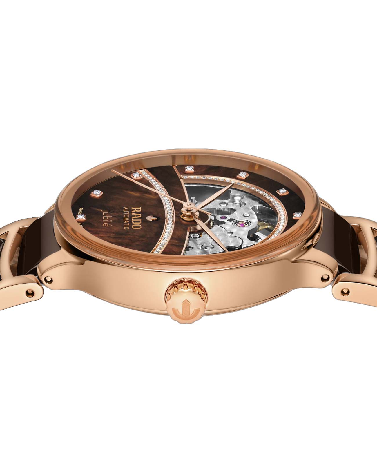 Женские механические швейцарские часы-скелетоны Rado Centrix Automatic Diamonds Open Heart R30029942 из коллекции Rado Centrix отражают собой часовое искусство в премиальном исполнении. Сапфировое стеклоСапфировое стеклоПрочный и надёжный материал из кристалла сапфира синтетического происхождения, характеризующийся особой твёрдостью и устойчивостью к царапинам и повреждениям. устойчивое к мелким механическим повреждениям. Корпус часов изготовлен из нержавеющей стали с PVD-покрытиемPVDУльтратонкое покрытие наносится в технике вакуумного напыления, сочетает в себе нитрид титана особой прочности со слоем золота или оксида хрома. Несёт в себе декоративную или защитную функцию.. Скелетонизированный циферблат инкрустирован бриллиантами. Класс водозащиты: 50 метров, позволит защитить корпус от случайных брызг или капель дождя. Браслет из стали и высокотехнологичной керамикиВысокотехнологичная керамикаИнновационный запатентованный Rado материал с гладкой или матовой поверхностью. Керамика за счёт кристаллической структуры обладает повышенной устойчивостью от возникновения царапин. Материал способен принимать температуру тела человека, обеспечивая невероятный комфорт при ношении. на раскладной застёжкеРаскладная застёжкаТакой тип застёжки используется только на браслетах из металла. Она никогда не раскрывается полностью, происходит разделение на 2 и более частей. Раскладывающая застёжка снизит вероятность потери часов к минимуму..
