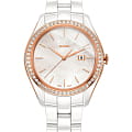 Аксессуар премиальной категории приковывает взгляды, оригинальный внешний вид очаровывает, хочется поближе рассмотреть каждую деталь. Перламутровый циферблат гармонирует с безелемБезельВнешний ободок, закрепляющий стекло. В спортивных часах так называется поворотное кольцо с делениями на циферблате, выполняет роль таймера – замеряет отрезки времени на шкале. Неподвижный безель – элемент декора. Однонаправленно вращающийся безель на дайверских часах позволяет фиксировать моменты погружения и выныривания на поверхность., декорированным 60-ю бриллиантами в 0,390 карат. Кварцевый калибр ETA 956.412. Стекло из сапфира имеет антибликовое покрытие. Корпус из плазменной керамикиВысокотехнологичная плазменная керамикаИнновационный материал, технология запатентована. Выплавление керамики осуществляется в печи при 20 000 °C, белоснежный материал под воздействием ультравысокой температуры приобретает уникальный блеск, присущий металлам. и нержавеющей стали с PVD-покрытиемPVDУльтратонкое покрытие наносится в технике вакуумного напыления, сочетает в себе нитрид титана особой прочности со слоем золота или оксида хрома. Несёт в себе декоративную или защитную функцию., керамический браслет со вставками из материала CeramosCeramosМатериал являет собой инновационное сочетание высокотехнологичной керамики и сплава металла. Он объединяет керамическую устойчивость к царапинам и металлический роскошный блеск. . Сохранение водонепроницаемости при давлении до 5 бар. . Индикация даты. Диаметр корпуса: 36 мм.