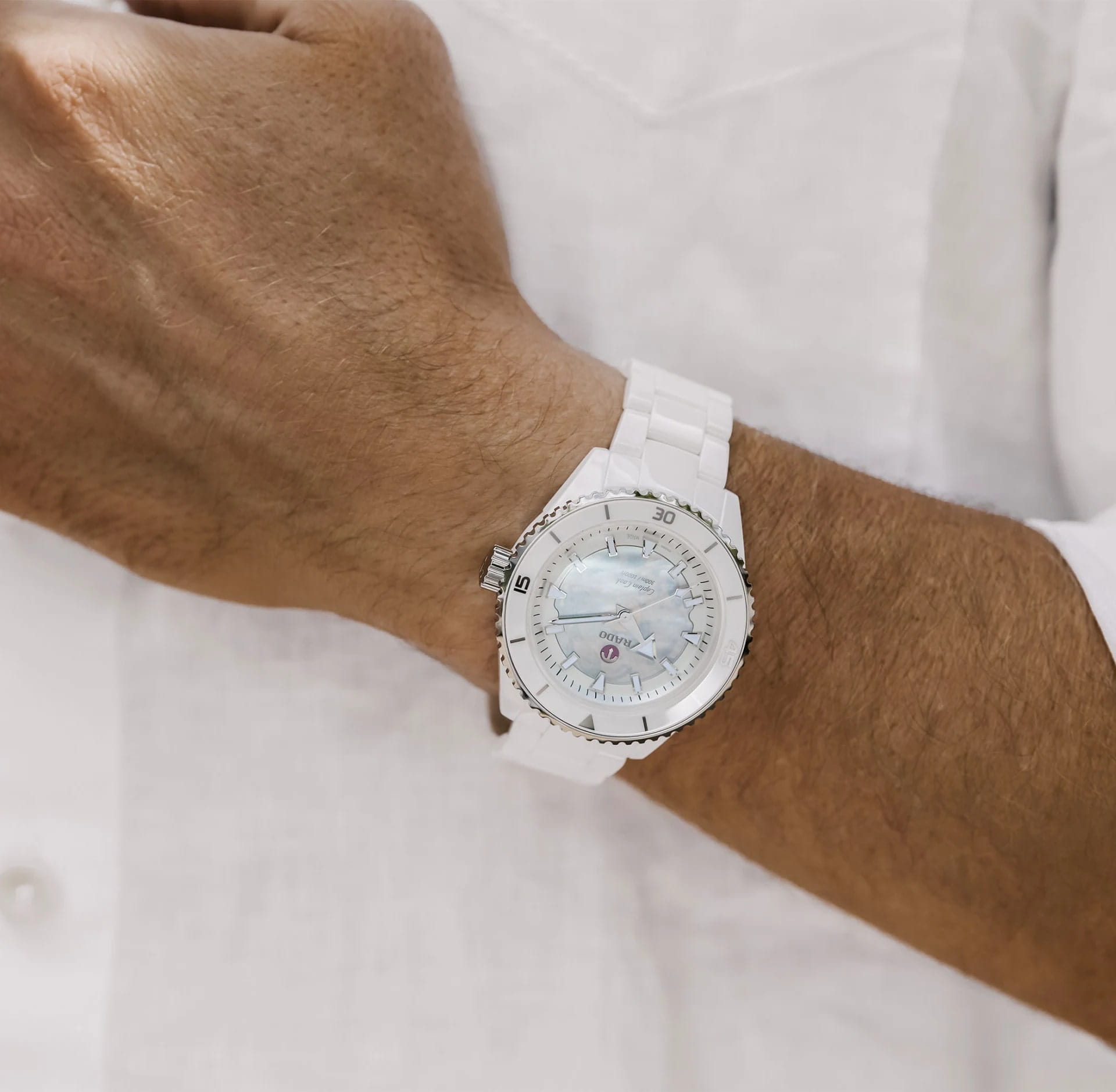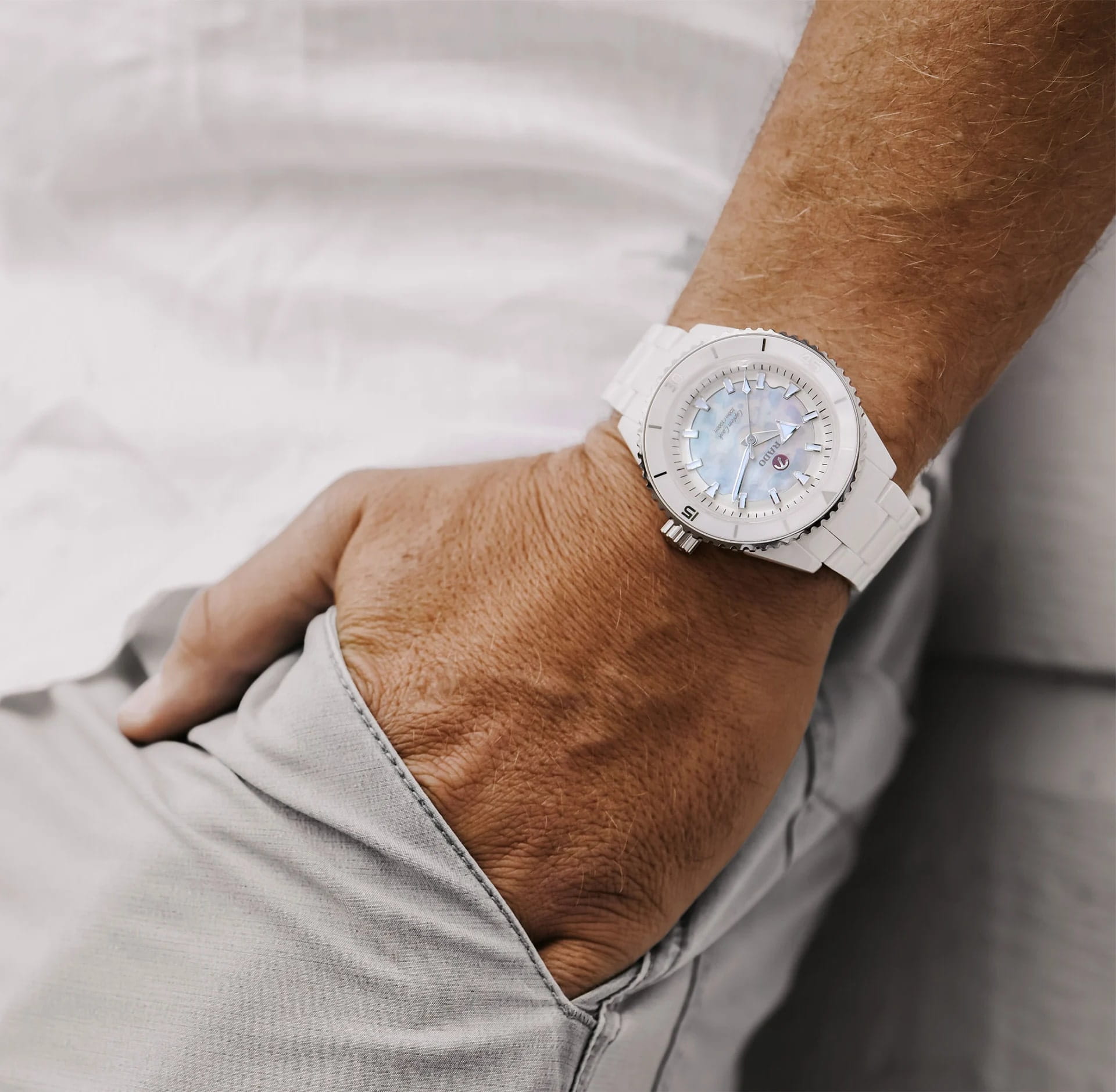 Высокотехнологичные керамические часы Captain Cook для дайверов (300 WR). Стрелки и индексы дайверских часов, сертифицированных по стандарту ISO 6425, покрыты SuperLuminova®, что обеспечивает отличную видимость на матовом оливково-зеленом циферблате. 43-миллиметровый моноблочный корпус изготовлен из матовой оливково-зеленой высокотехнологичной керамикиВысокотехнологичная керамикаИнновационный запатентованный Rado материал с гладкой или матовой поверхностью. Керамика за счёт кристаллической структуры обладает повышенной устойчивостью от возникновения царапин. Материал способен принимать температуру тела человека, обеспечивая невероятный комфорт при ношении., а вращающийся безельБезельВнешний ободок, закрепляющий стекло. В спортивных часах так называется поворотное кольцо с делениями на циферблате, выполняет роль таймера – замеряет отрезки времени на шкале. Неподвижный безель – элемент декора. Однонаправленно вращающийся безель на дайверских часах позволяет фиксировать моменты погружения и выныривания на поверхность. - из полированной нержавеющей стали. Внутри механизм Rado R736 с автоподзаводом превосходит стандартные требования по проверке точности в 3-5 положениях и обеспечивает 80 часов запаса хода. Какой бы ни была ваша область исследований, ваш высокотехнологичный керамический дайвер Captain Cook станет надежным партнером на долгие годы. Стальной браслет на раскладной застёжкеРаскладная застёжкаТакой тип застёжки используется только на браслетах из металла. Она никогда не раскрывается полностью, происходит разделение на 2 и более частей. Раскладывающая застёжка снизит вероятность потери часов к минимуму..