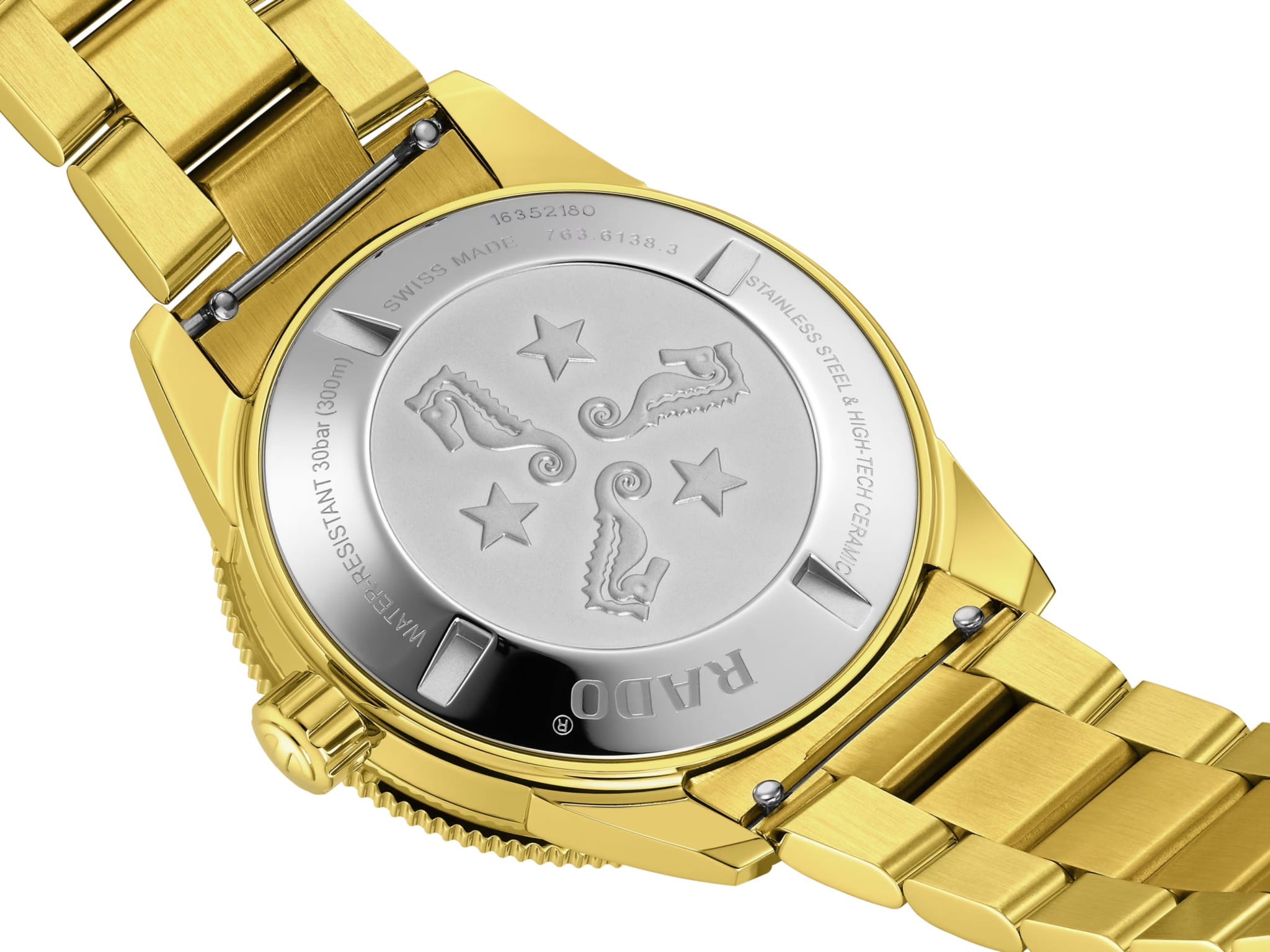 Мужские механические часы с автоматическим механизмом Rado Captain Cook Automatic R32136323. Корпус и браслет часов изготовлены из нержавеющей стали с PVD-покрытиемPVDУльтратонкое покрытие наносится в технике вакуумного напыления, сочетает в себе нитрид титана особой прочности со слоем золота или оксида хрома. Несёт в себе декоративную или защитную функцию.. Сапфировое стеклоСапфировое стеклоПрочный и надёжный материал из кристалла сапфира синтетического происхождения, характеризующийся особой твёрдостью и устойчивостью к царапинам и повреждениям. с антибликовым покрытиемАнтибликовое покрытиеСлой оксида металла в 0,13-0,3 микрон, благодаря которому стекло часов не бликует и не отражает свет. Антибликовое покрытие уменьшает отражение света в 10 раз, обеспечивая отличную читаемость показателей циферблата., устойчивое к мелким механическим повреждениям. Стальной браслет на раскладной застёжкеРаскладная застёжкаТакой тип застёжки используется только на браслетах из металла. Она никогда не раскрывается полностью, происходит разделение на 2 и более частей. Раскладывающая застёжка снизит вероятность потери часов к минимуму.. Класс водозащиты: 300 метров, позволит плавать, нырять и заниматься другими водными видами спорта. Вращающийся безельБезельВнешний ободок, закрепляющий стекло. В спортивных часах так называется поворотное кольцо с делениями на циферблате, выполняет роль таймера – замеряет отрезки времени на шкале. Неподвижный безель – элемент декора. Однонаправленно вращающийся безель на дайверских часах позволяет фиксировать моменты погружения и выныривания на поверхность. с PVD-покрытиемPVDУльтратонкое покрытие наносится в технике вакуумного напыления, сочетает в себе нитрид титана особой прочности со слоем золота или оксида хрома. Несёт в себе декоративную или защитную функцию.. Стрелки и метки с люминесцентным покрытиемЛюминесцентное покрытиеПозволяет считывать показания времени в темноте. Производители наносят на стрелки, часовые индексы, безель или поверхность циферблата светонакопительный состав, дающий холодное свечение.. Окошко даты находится в положении 3 часа.