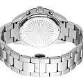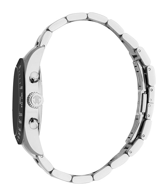 ROBERTO CAVALLI Uomo Chrono RC5G046M1065 — стильные итальянские часы с функцией хронографаХронографФункция позволяет измерять отрезки времени с особой точностью: часы, минуты, секунды. Верным признаком хронографа является наличие на циферблате 3 дополнительных окошек-счётчиков., которые сочетают в себе элегантность и современный функционал. Круглый корпус диаметром 42 мм выполнен из нержавеющей стали, толщина корпуса составляет 12 мм, что придает модели выразительный внешний вид и надежную защиту от внешних воздействий. Часы оснащены кварцевым механизмом, также обладают функцией отображения даты, что делает их удобными для ежедневного использования. Минеральное стеклоМинеральное стеклоМинеральное стекло представляет собой искусственно выращенный минерал кварца. Такое стекло отличается особой устойчивостью к повреждениям и царапинам. Уступает по некоторым качествам сапфировому стеклу. защищает часы от царапин. Водозащита 100 метров, позволит плавать, нырять и заниматься другими водными видами спорта. Неподвижный безельБезельВнешний ободок, закрепляющий стекло. В спортивных часах так называется поворотное кольцо с делениями на циферблате, выполняет роль таймера – замеряет отрезки времени на шкале. Неподвижный безель – элемент декора. Однонаправленно вращающийся безель на дайверских часах позволяет фиксировать моменты погружения и выныривания на поверхность. с PVD-покрытиемPVDУльтратонкое покрытие наносится в технике вакуумного напыления, сочетает в себе нитрид титана особой прочности со слоем золота или оксида хрома. Несёт в себе декоративную или защитную функцию.. Стальной браслет на застёжке-бабочке с кнопкамиЗастёжка "бабочка"Такой вид застёжки дополняется предохранителями, помогающими избежать случайного раскрытия браслета. Обладают изящным исполнением. обеспечивает комфортное ношение. Стрелки с люминесцентным покрытиемЛюминесцентное покрытиеПозволяет считывать показания времени в темноте. Производители наносят на стрелки, часовые индексы, безель или поверхность циферблата светонакопительный состав, дающий холодное свечение. обеспечивают отличную читаемость в любое время суток.