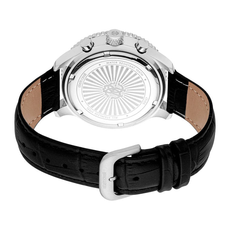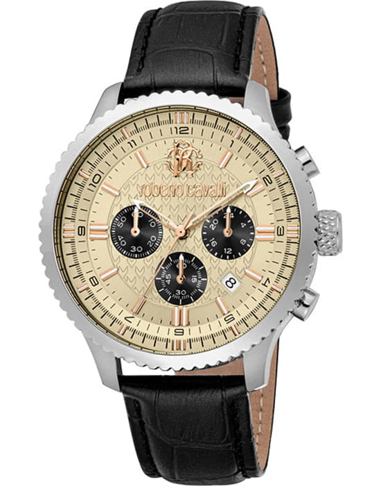 Roberto Cavalli Stile RC5G127L0015— мужская кварцевая модель с ярко выраженным спортивным характером, сочетающая функциональность и надёжность. Корпус диаметром 44 мм выполнен из нержавеющей стали, сочетание матовых и полированных поверхностей придаёт часам современный вид. Защитную роль выполняет прочное минеральное стеклоМинеральное стеклоМинеральное стекло представляет собой искусственно выращенный минерал кварца. Такое стекло отличается особой устойчивостью к повреждениям и царапинам. Уступает по некоторым качествам сапфировому стеклу., устойчивое к повседневным воздействиям. Водозащита 100 м позволяет без опасений использовать модель во время плавания и активного отдыха. На циферблате реализованы функции хронографаХронографФункция позволяет измерять отрезки времени с особой точностью: часы, минуты, секунды. Верным признаком хронографа является наличие на циферблате 3 дополнительных окошек-счётчиков. и даты, благодаря чему часы сочетают спортивную эстетику и практичность. Кожаный ремешок шириной 20 мм подчеркивает классический стиль, обеспечивает удобство в ношении и гармонично завершает дизайн, делая модель универсальным спутником как для повседневного образа, так и для активного досуга.