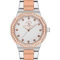 Женские кварцевые часы Santa Barbara Polo & Racquet Club Unique SB.1.10552-5 — это стильный аксессуар, подчеркивающий индивидуальность. Изысканный корпус диаметром 35 мм выполнен из нержавеющей стали 316L с 12-гранным безелемБезельВнешний ободок, закрепляющий стекло. В спортивных часах так называется поворотное кольцо с делениями на циферблате, выполняет роль таймера – замеряет отрезки времени на шкале. Неподвижный безель – элемент декора. Однонаправленно вращающийся безель на дайверских часах позволяет фиксировать моменты погружения и выныривания на поверхность. с IP-покрытиемIP-покрытиеМетод ионного напыления. Демонстрирует повышенную устойчивость к истиранию, окислению и химическим веществам. Под воздействием высокого давления и температуры около 1500°C молекулы металла надёжно соединяются с частицами корпуса часов., украшенным кристаллами. Изящный циферблат дополнен накладными метками в виде точек, украшенных кристаллами, а также фирменным логотипом. Стрелки скругленные с люминесцентным покрытиемЛюминесцентное покрытиеПозволяет считывать показания времени в темноте. Производители наносят на стрелки, часовые индексы, безель или поверхность циферблата светонакопительный состав, дающий холодное свечение., обеспечивающим хорошую читаемость в темноте. Циферблат защищён минеральным стекломМинеральное стеклоМинеральное стекло представляет собой искусственно выращенный минерал кварца. Такое стекло отличается особой устойчивостью к повреждениям и царапинам. Уступает по некоторым качествам сапфировому стеклу.. Часы оснащены надежным стальным браслетом с раскладной застёжкойРаскладная застёжкаТакой тип застёжки используется только на браслетах из металла. Она никогда не раскрывается полностью, происходит разделение на 2 и более частей. Раскладывающая застёжка снизит вероятность потери часов к минимуму. с частичным IP-покрытиемIP-покрытиеМетод ионного напыления. Демонстрирует повышенную устойчивость к истиранию, окислению и химическим веществам. Под воздействием высокого давления и температуры около 1500°C молекулы металла надёжно соединяются с частицами корпуса часов.. Водонепроницаемость 50 м позволяет использовать часы в повседневных условиях. Идеальный выбор для тех, кто ценит элегантный дизайн и качество.