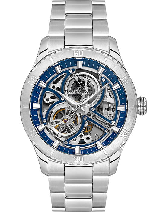 Мужские механические часы с автоподзаводом Santa Barbara Polo & Racquet Club Luxury — это стильный и функциональный аксессуар для современного джентльмена. Изысканный корпус из стали 316L  диаметром 42.5 мм. Изящный скелетонизированный циферблат украшен фирменным логотипом, с метками. Накладные лаконичные метки и стрелки с люминесцентным покрытиемЛюминесцентное покрытиеПозволяет считывать показания времени в темноте. Производители наносят на стрелки, часовые индексы, безель или поверхность циферблата светонакопительный состав, дающий холодное свечение., обеспечивающим хорошую читаемость в темноте. Циферблат защищён минеральным стекломМинеральное стеклоМинеральное стекло представляет собой искусственно выращенный минерал кварца. Такое стекло отличается особой устойчивостью к повреждениям и царапинам. Уступает по некоторым качествам сапфировому стеклу., устойчивым к царапинам и механическим повреждениям. Стальной браслет на застёжке-бабочке с кнопкамиЗастёжка "бабочка"Такой вид застёжки дополняется предохранителями, помогающими избежать случайного раскрытия браслета. Обладают изящным исполнением. обеспечивает комфортное и безопасное ношение. Водонепроницаемость 50 м позволяет использовать часы в повседневных условиях. Идеальный выбор для тех, кто ценит элегантность, точность и надёжность.