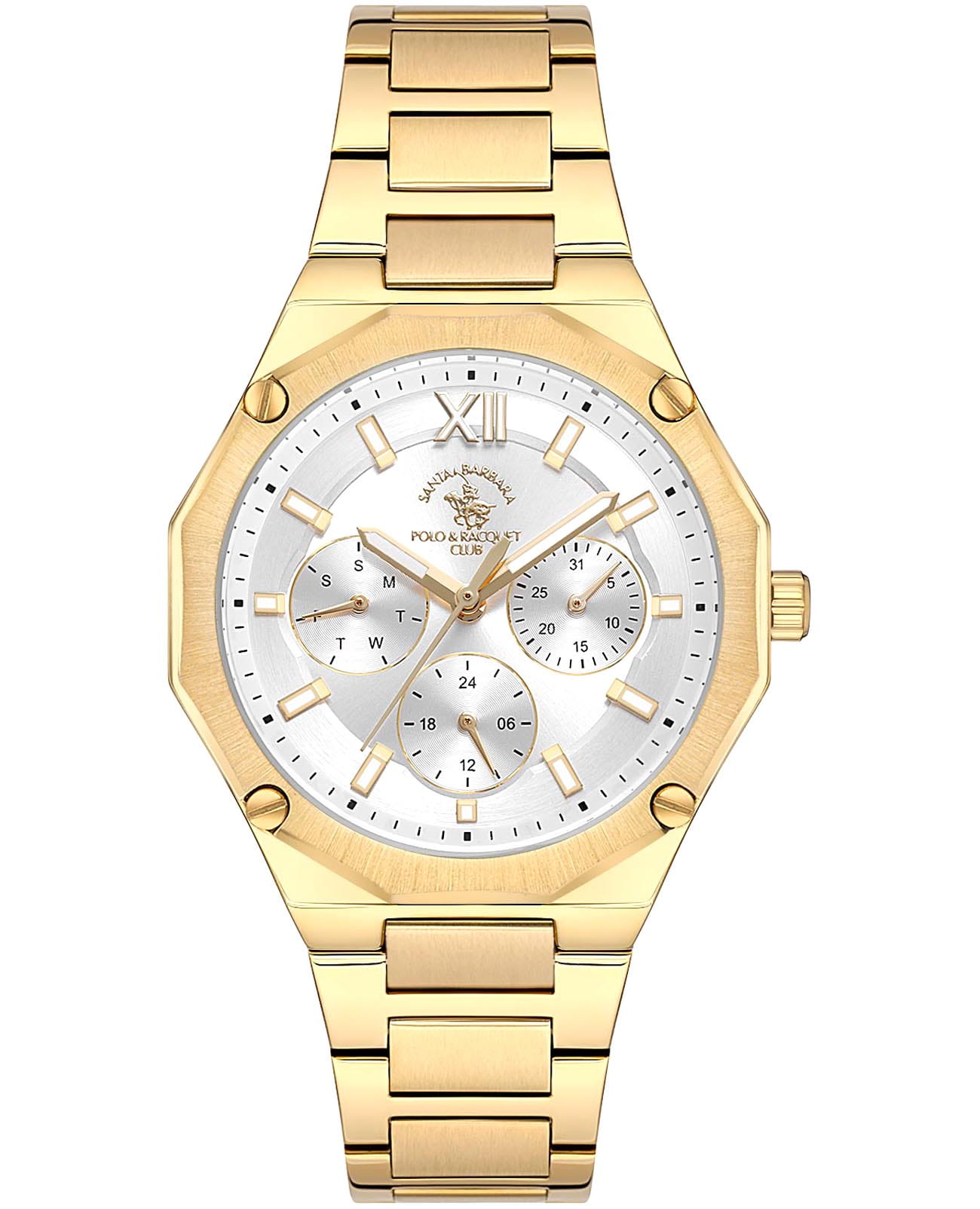 Женские кварцевые Santa Barbara Polo & Racquet Club Luxury SB.1.10596-3 — воплощение элегантности и технического совершенства. Изысканный корпус из нержавеющей стали с IP-покрытиемIP-покрытиеМетод ионного напыления. Демонстрирует повышенную устойчивость к истиранию, окислению и химическим веществам. Под воздействием высокого давления и температуры около 1500°C молекулы металла надёжно соединяются с частицами корпуса часов. золотистого цвета, диаметром 36 мм, что делает их устойчивыми к внешним воздействиям и придает благородный вид. Стрелки и метки с люминесцентным покрытиемЛюминесцентное покрытиеПозволяет считывать показания времени в темноте. Производители наносят на стрелки, часовые индексы, безель или поверхность циферблата светонакопительный состав, дающий холодное свечение., обеспечивающим хорошую читаемость в темноте. Изящный циферблат защищён минеральным стекломМинеральное стеклоМинеральное стекло представляет собой искусственно выращенный минерал кварца. Такое стекло отличается особой устойчивостью к повреждениям и царапинам. Уступает по некоторым качествам сапфировому стеклу., устойчивое к царапинам и механическим повреждениям. Браслет из стали с IP-покрытиемIP-покрытиеМетод ионного напыления. Демонстрирует повышенную устойчивость к истиранию, окислению и химическим веществам. Под воздействием высокого давления и температуры около 1500°C молекулы металла надёжно соединяются с частицами корпуса часов. на застёжке «бабочка» с кнопкамиЗастёжка "бабочка"Такой вид застёжки дополняется предохранителями, помогающими избежать случайного раскрытия браслета. Обладают изящным исполнением. обеспечивает комфортное и безопасное ношение. 12-ти и 24-х часовой формат времени. Водонепроницаемость 50 метров позволит защитить корпус от случайных брызг или капель дождя. Идеальный выбор для тех, кто ценит элегантный дизайн и качество.