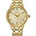 Женские японские часы Seiko Discover More SRZ552P1 c кварцевым механизмом с высокой точностью. Сапфировое стеклоСапфировое стеклоПрочный и надёжный материал из кристалла сапфира синтетического происхождения, характеризующийся особой твёрдостью и устойчивостью к царапинам и повреждениям., устойчивое к появлению царапин, обладающее высокой прозрачностью. Класс водозащиты: 50 метров, позволит плавать, нырять и заниматься другими водными видами спорта. Корпус и браслет часов изготовлен из стали с частичным PVDPVDУльтратонкое покрытие наносится в технике вакуумного напыления, сочетает в себе нитрид титана особой прочности со слоем золота или оксида хрома. Несёт в себе декоративную или защитную функцию. покрытием. Циферблат украшен кристаллами. Браслет с тройной раскладной застёжкойРаскладная застёжкаТакой тип застёжки используется только на браслетах из металла. Она никогда не раскрывается полностью, происходит разделение на 2 и более частей. Раскладывающая застёжка снизит вероятность потери часов к минимуму.. Seiko — это гармония изящного дизайна и технологичной надёжности, компактный и стильный выбор для повседневной классики.