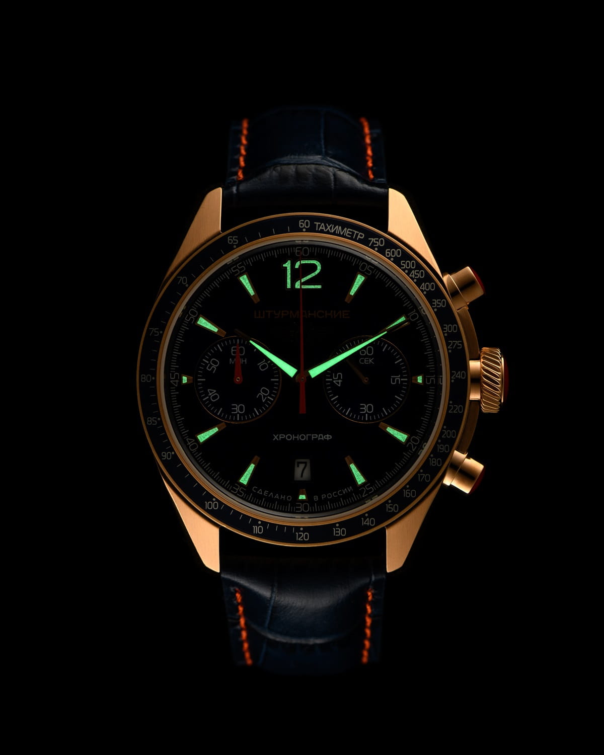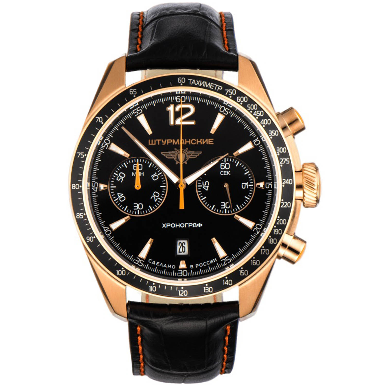 Мужские российские кварцевые часы-хронографХронографФункция позволяет измерять отрезки времени с особой точностью: часы, минуты, секунды. Верным признаком хронографа является наличие на циферблате 3 дополнительных окошек-счётчиков. с секундомеромСекундомерСекундоме́р — прибор, способный измерять интервалы времени с точностью до долей секунды. Штурманские 6S21/4799416, кварцевый механизм с высокой точностью. Класс водозащиты: 50 метров, позволит защитить корпус от случайных брызг или капель дождя. Корпус часов изготовлен из стали с PVD-покрытиемPVDУльтратонкое покрытие наносится в технике вакуумного напыления, сочетает в себе нитрид титана особой прочности со слоем золота или оксида хрома. Несёт в себе декоративную или защитную функцию.. ТахиметрТахиметрРазмеченная шкала, располагается на ободке или безеле часов. Тахиметр позволяет рассчитать скорость на определённом участке пути, расстояние измеряется в километрах или милях.. Кожаный ремешок на стандартной застёжке. Минеральное стеклоМинеральное стеклоМинеральное стекло представляет собой искусственно выращенный минерал кварца. Такое стекло отличается особой устойчивостью к повреждениям и царапинам. Уступает по некоторым качествам сапфировому стеклу. устойчивое к мелким механическим повреждениям. Стрелки и метки с люминесцентным покрытиемЛюминесцентное покрытиеПозволяет считывать показания времени в темноте. Производители наносят на стрелки, часовые индексы, безель или поверхность циферблата светонакопительный состав, дающий холодное свечение..