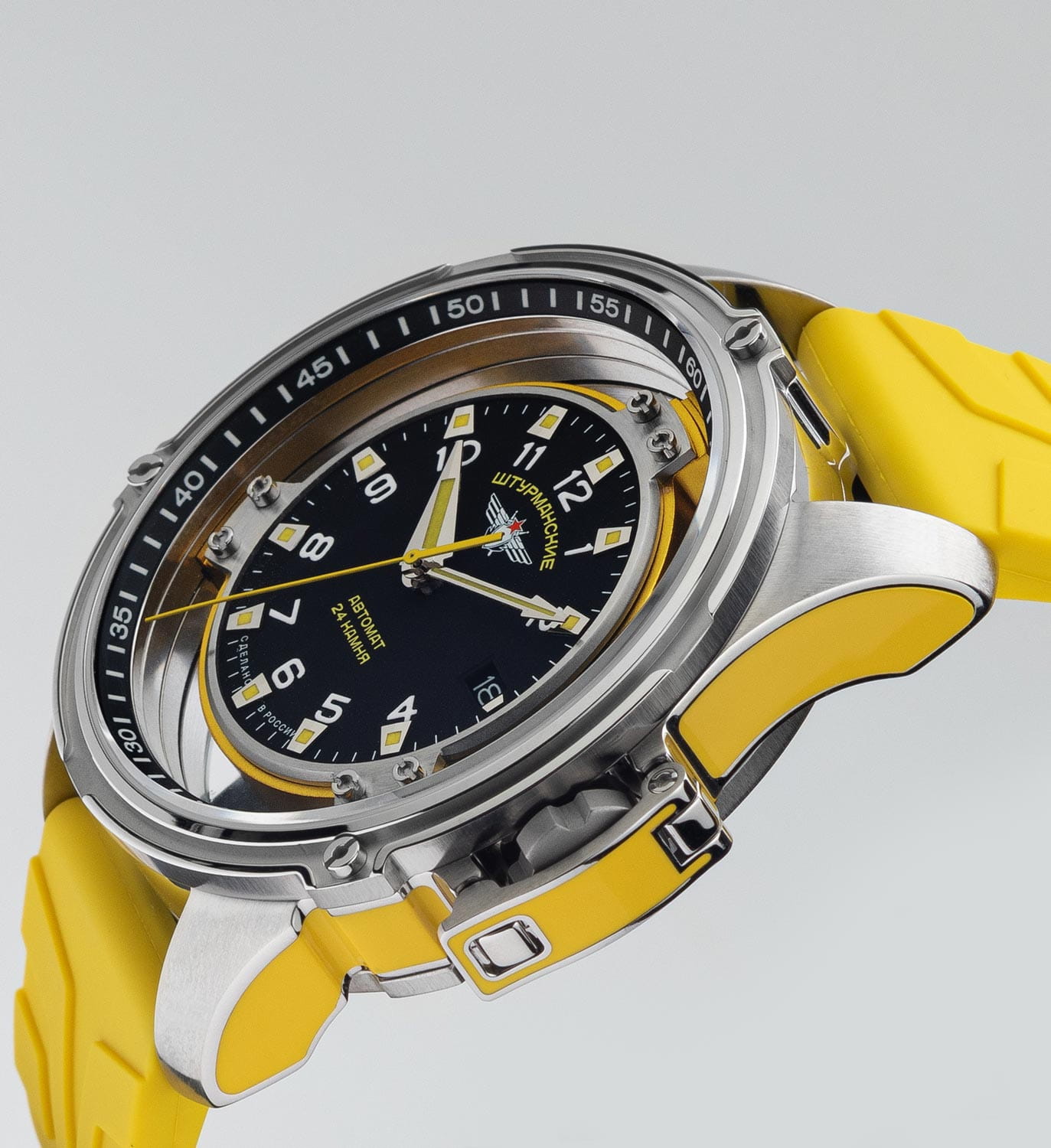 Штурманские мужские российские механические часы Штурманские Марс 2 NH35/9035977, механический механизм (автоматический калибр) с высокой точностью. Сапфировое стеклоСапфировое стеклоПрочный и надёжный материал из кристалла сапфира синтетического происхождения, характеризующийся особой твёрдостью и устойчивостью к царапинам и повреждениям. устойчивое к появлению царапин, обладающее высокой прозрачностью. Класс водозащиты: 50 метров, позволит защитить корпус от случайных брызг или капель дождя. Корпус часов изготовлен из стали. Силиконовый ремешок на стандартной застёжке. Стрелки и метки с люминесцентным покрытиемЛюминесцентное покрытиеПозволяет считывать показания времени в темноте. Производители наносят на стрелки, часовые индексы, безель или поверхность циферблата светонакопительный состав, дающий холодное свечение.. Они защищены от влаги и вибрации, оснащены надежным японским калибром NH35 Seiko с автоматическим подзаводом и запасом хода 41 час. Боковые поверхности корпуса покрыты эмалью ручной работы. Заводная головка дополнительно защищена от попадания влаги. Амортизаторы между корпусом и механизмом защищают калибр от вибрации.
