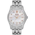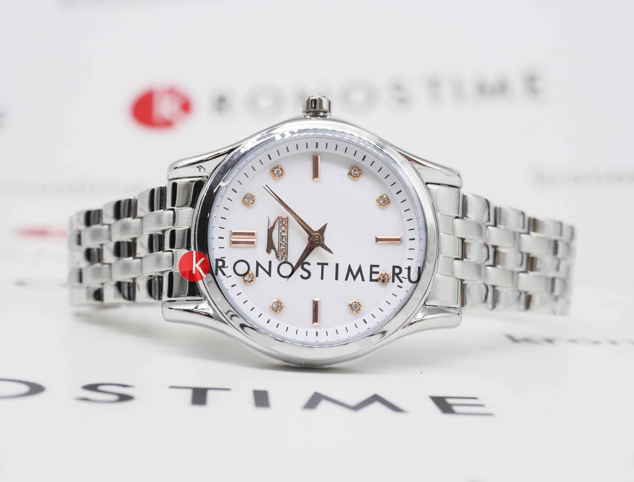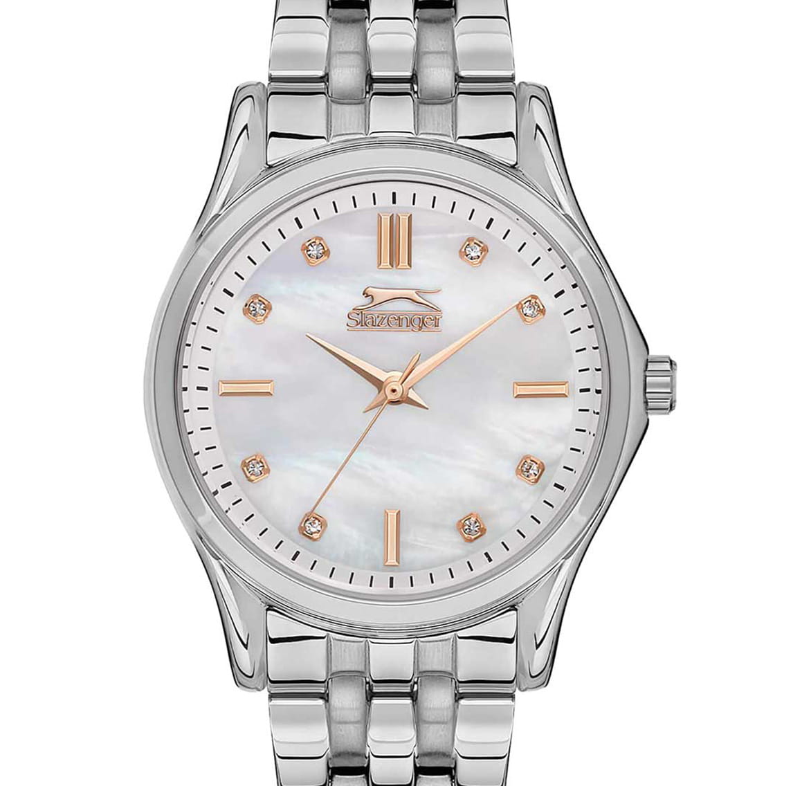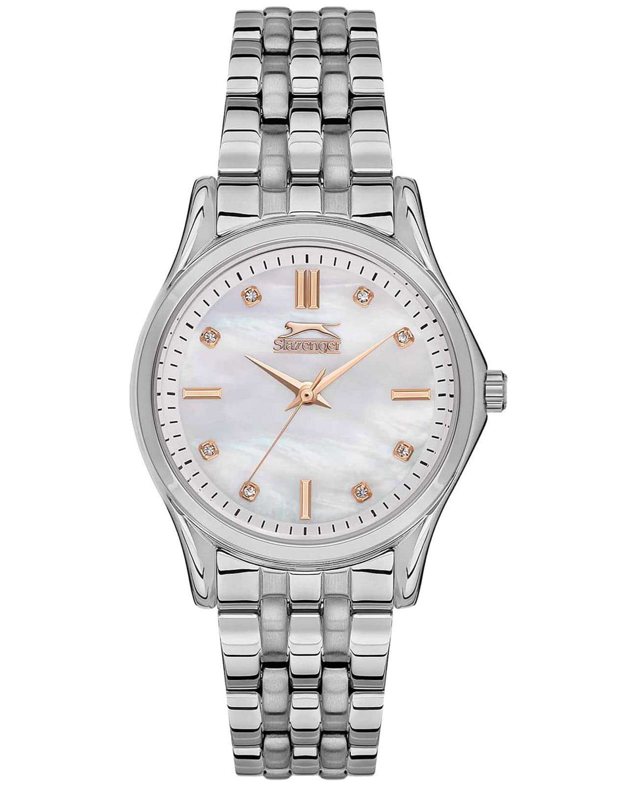 Женские наручные часы Slazenger SL.09.2154.3.01 сочетают в себе классический дизайн и надежность современных технологий. Модель обладает круглым корпусом диаметром 32 мм, изготовленным из суперметалла, что обеспечивает высокую устойчивость к внешним воздействиям. Индексы украшены фианитами. Браслет выполнен из суперметалла с раскладной застежкойРаскладной замокДанный вариант застежки используется только на часах с металлическим браслетом. Отличительная особенность такого крепления в том, что длина браслета становится универсальной и вы можете самостоятельно отрегулировать нужный вам размер – застежка просто двигается по браслету часов., гарантирующей комфортное ношение и безопасность. Циферблат перламутрового цвета декорирован золотистыми стрелками и индексами, которые обеспечивают читаемость времени даже в условиях недостаточной освещенности. Для защиты используется минеральное стеклоМинеральное стеклоМинеральное стекло представляет собой искусственно выращенный минерал кварца. Такое стекло отличается особой устойчивостью к повреждениям и царапинам. Уступает по некоторым качествам сапфировому стеклу., обеспечивающее прочную защиту от царапин. Часы работают на кварцевом механизме, что гарантирует точное время без необходимости подзаводки. Водонепроницаемость часов достигает 3 атмосфер, что позволяет использовать их при мытье рук или хождении под мелким дождем, однако не рекомендуется для плавания или других водных видов спорта. Вес модели составляет 80 грамма.