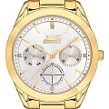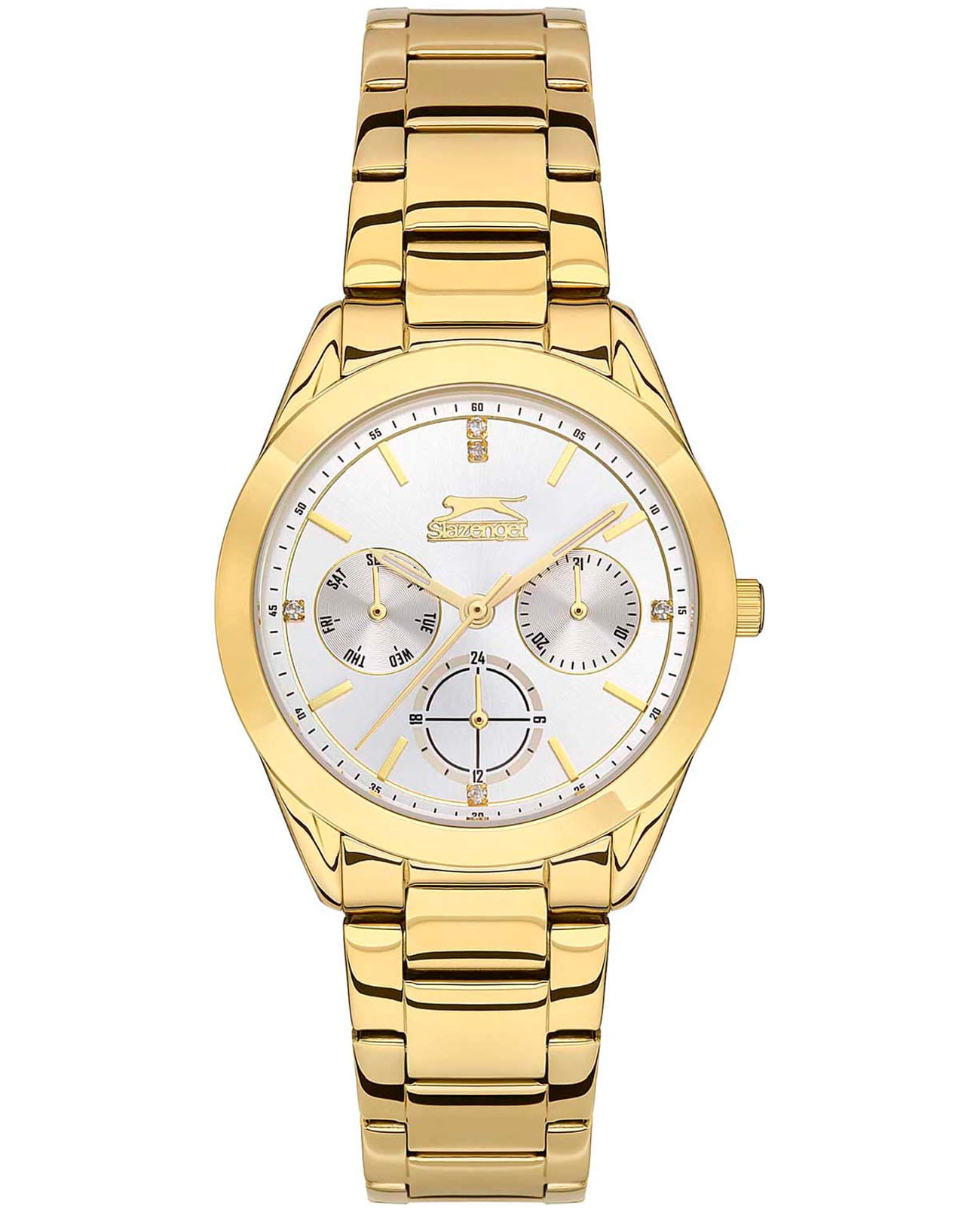Женские наручные часы Slazenger SL.09.2032.4.03 сочетают в себе элегантность и функциональность для современных женщин. Модель обладает круглым корпусом диаметром 35 мм, изготовленным из суперметалла с IP-покрытиемIP-покрытиеМетод ионного напыления. Демонстрирует повышенную устойчивость к истиранию, окислению и химическим веществам. Под воздействием высокого давления и температуры около 1500°C молекулы металла надёжно соединяются с частицами корпуса часов., что придает изделию роскошный внешний вид и обеспечивает защиту от царапин. Золотистый тон корпуса гармонирует с серебристым циферблатом, украшенным логотипом бренда и выполненном по технологии Sunray (солнечные лучи), создающей игру света и глубины. Часы комплектуются браслетом из суперметалла с IP-покрытиемIP-покрытиеМетод ионного напыления. Демонстрирует повышенную устойчивость к истиранию, окислению и химическим веществам. Под воздействием высокого давления и температуры около 1500°C молекулы металла надёжно соединяются с частицами корпуса часов., который надежно фиксируется благодаря раскладной застежкеРаскладной замокДанный вариант застежки используется только на часах с металлическим браслетом. Отличительная особенность такого крепления в том, что длина браслета становится универсальной и вы можете самостоятельно отрегулировать нужный вам размер – застежка просто двигается по браслету часов.. Для защиты используется минеральное стеклоМинеральное стеклоМинеральное стекло представляет собой искусственно выращенный минерал кварца. Такое стекло отличается особой устойчивостью к повреждениям и царапинам. Уступает по некоторым качествам сапфировому стеклу., обеспечивающее прочную защиту от повреждений. Механизм часов кварцевый, что гарантирует высокую точность хода без необходимости подзаводки. На малых циферблатах отображаются дата, день недели и текущее время в 24-часовом формате, что делает модель не только стильным аксессуаром, но и практичным инструментом для ежедневного использования. Водонепроницаемость часов достигает класса WR30, что позволяет использовать их в условиях легкого контакта с водой, например, во время мытья рук или попадания брызг, однако не рекомендуется для плавания или дайвинга. Стильные женские часы Slazenger SL.09.2032.4.03 станут идеальным дополнением как для повседневного образа, так и для деловых встреч или торжественных мероприятий.
